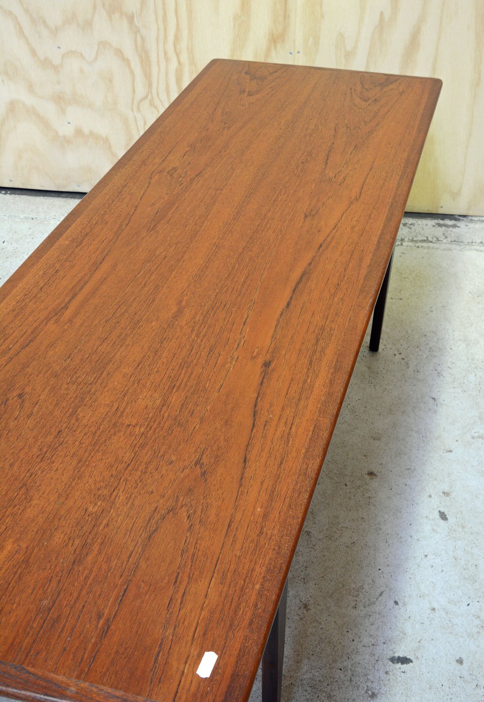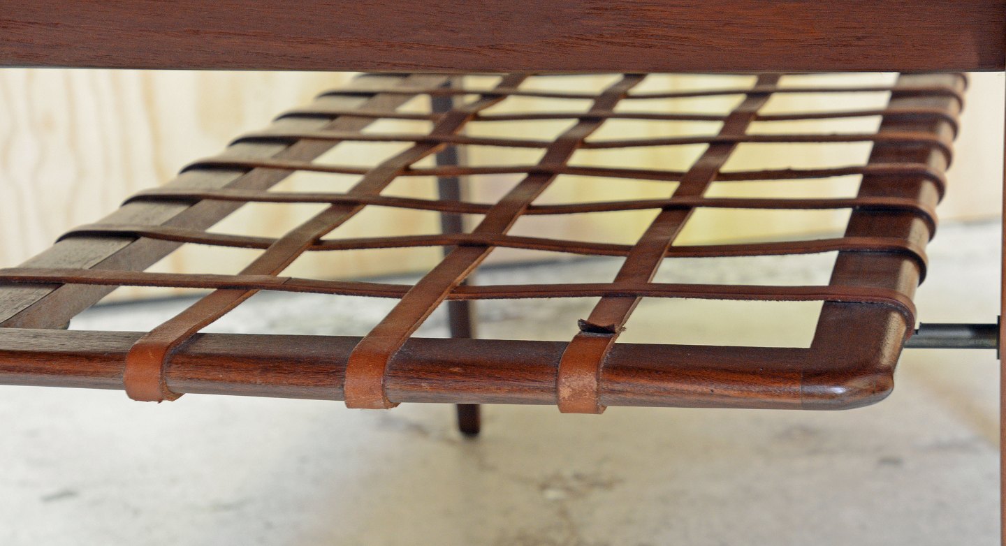 Sofabord i teaktræ med hylde af remme i kernelæder. Bordet fremstår med enkelte brugsspor.