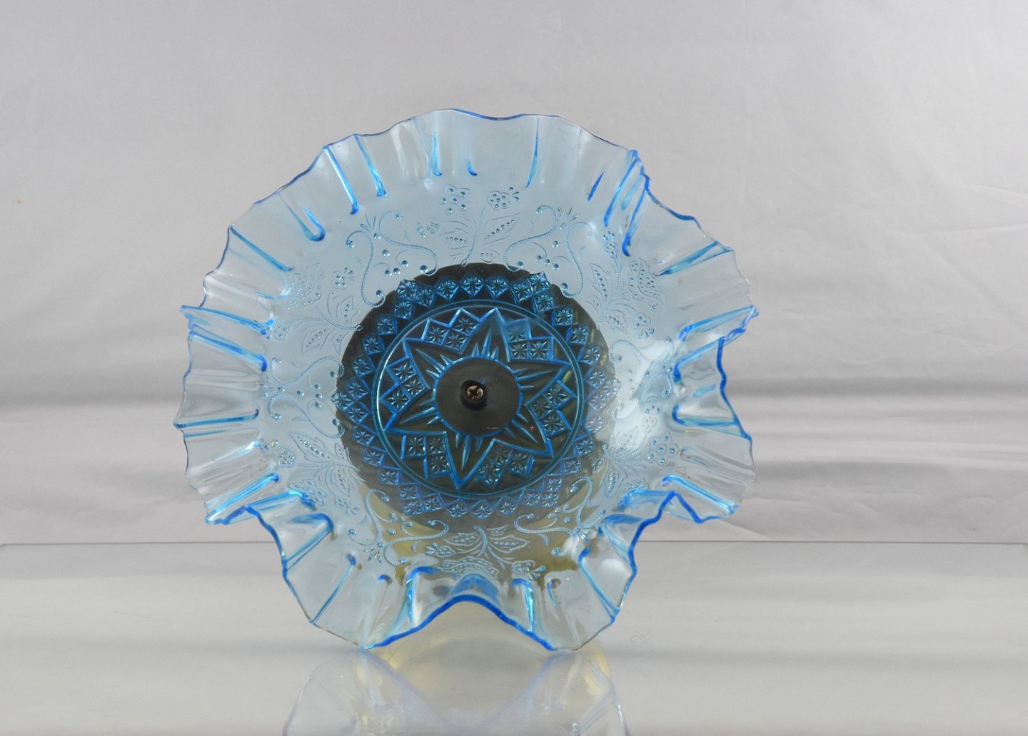 Blå gennemsigtig glasopsats med blondekant og messing fod