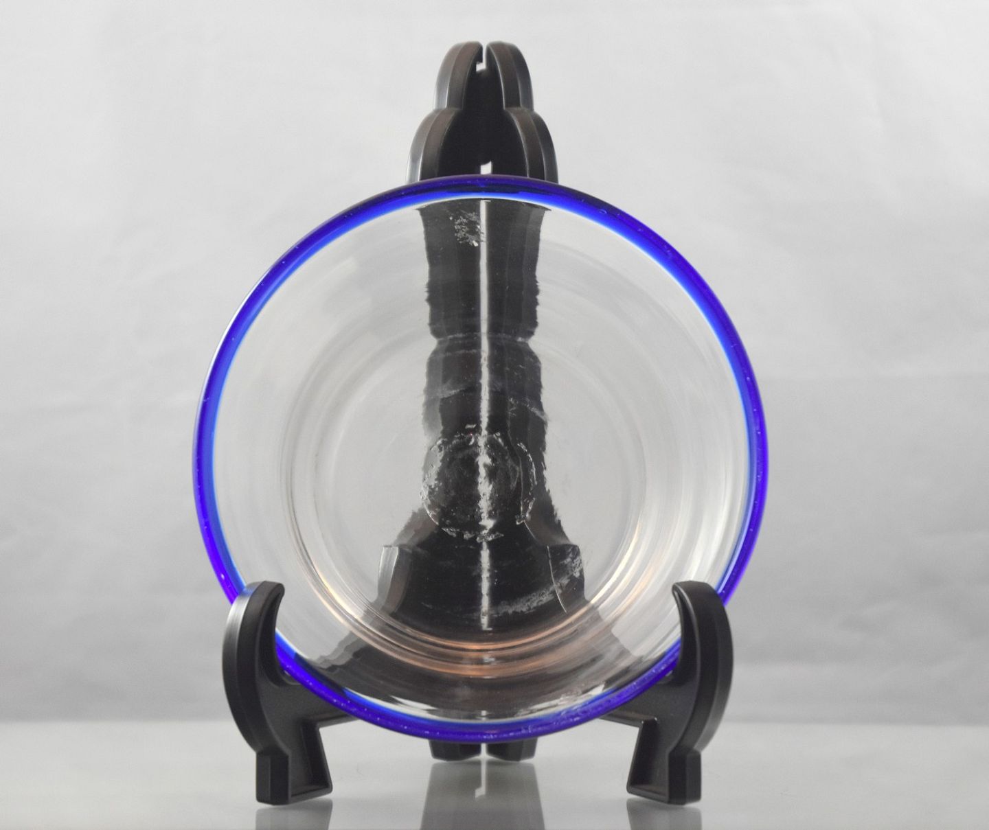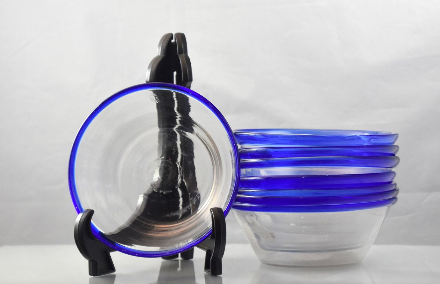 Ymer-(morgenmads) skåle. Klart glas med blå kant.