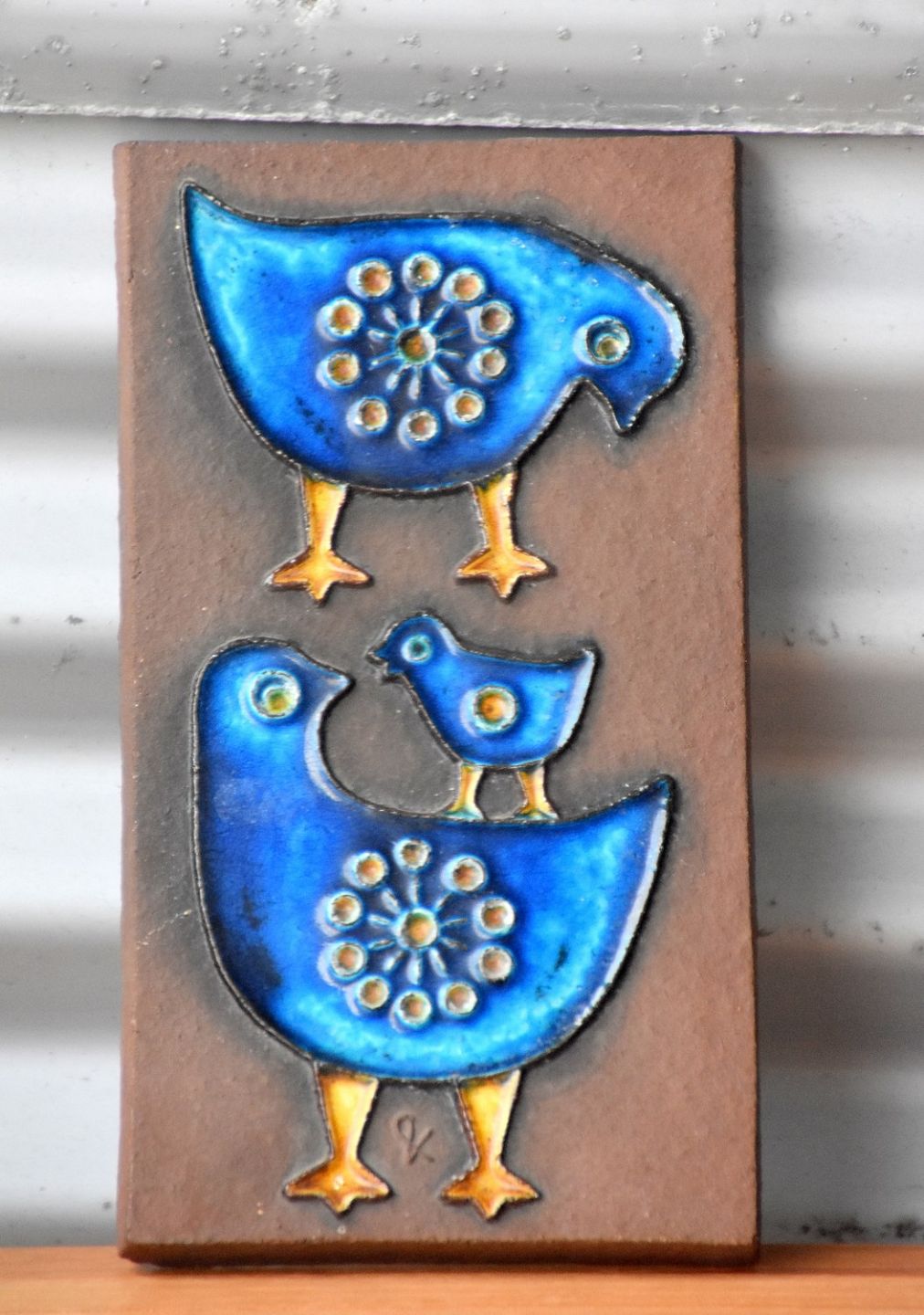 Tre blå fugle på brun baggrund. Relief, stentøj