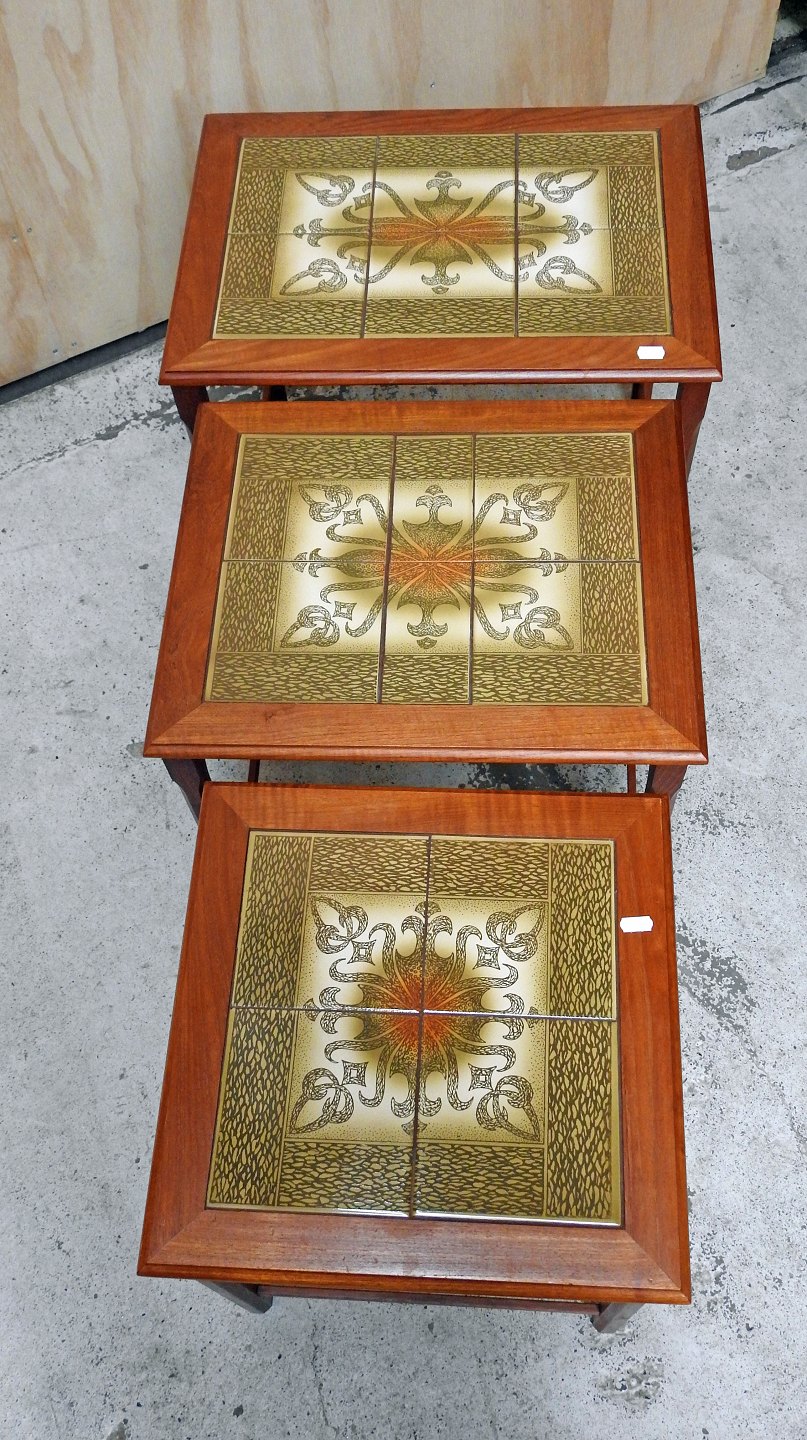 Indskudsborde i teaktræ med kakler. Dansk møbeldesign. Tre borde med mønstrede kakler i grøn og brune farver.
