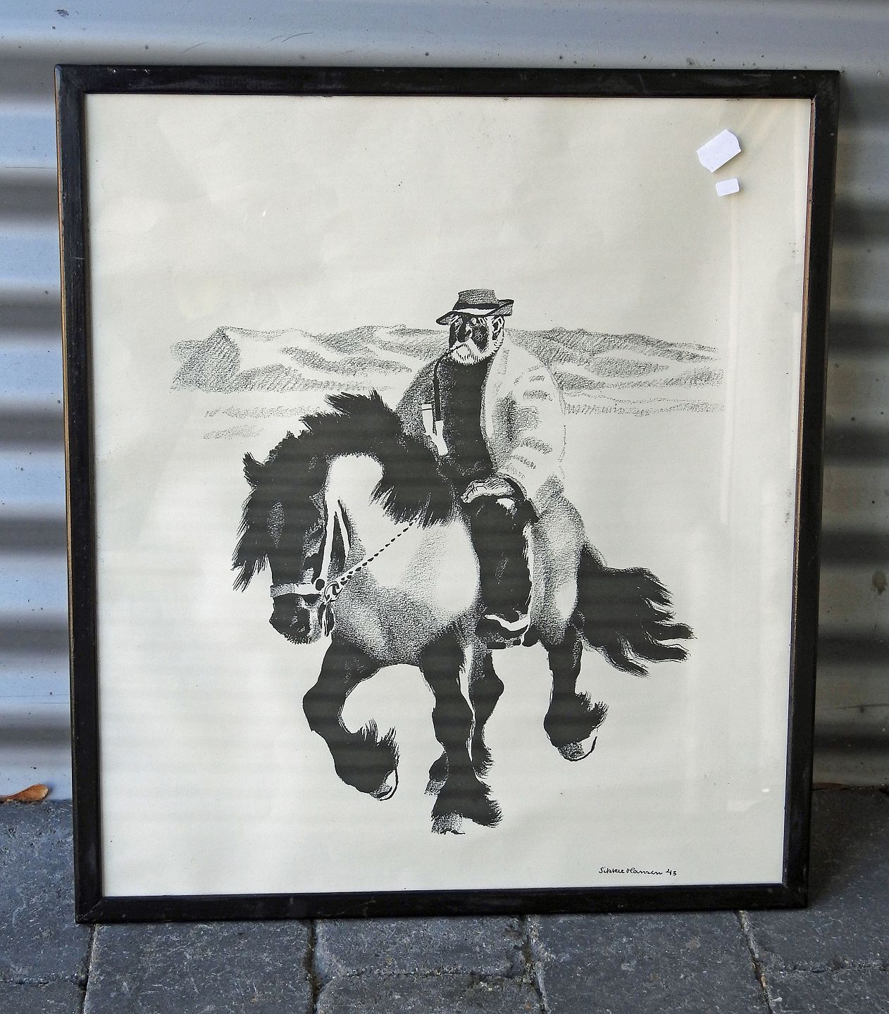 Indrammet tryk af Sikker Hansen med motiv af mand på arbejdshest.