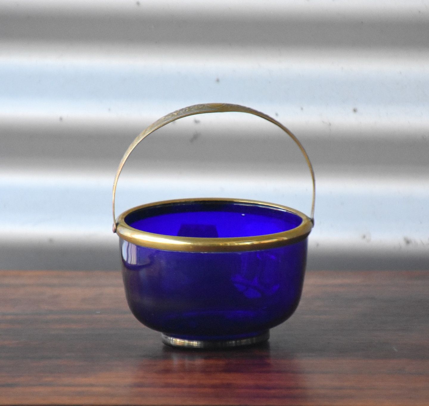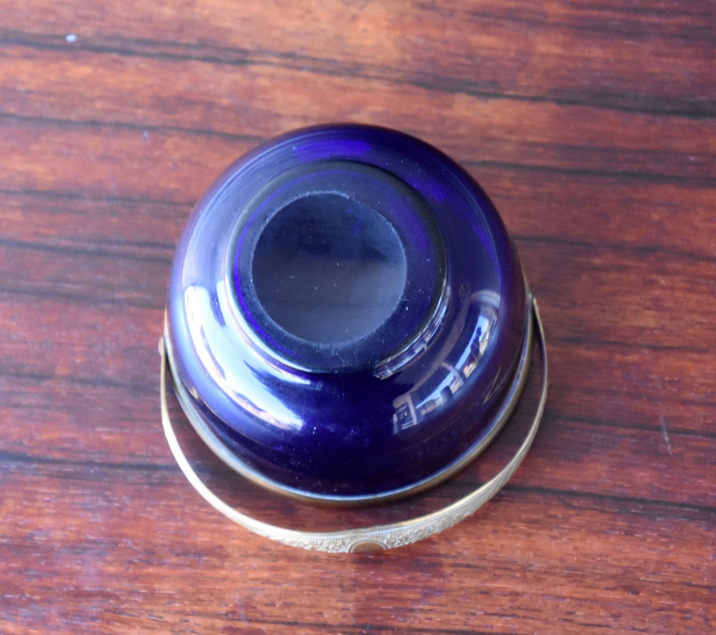 Holmegaard Blå glasskål med messing hank og kant.
