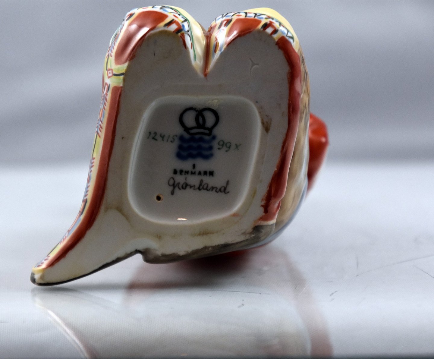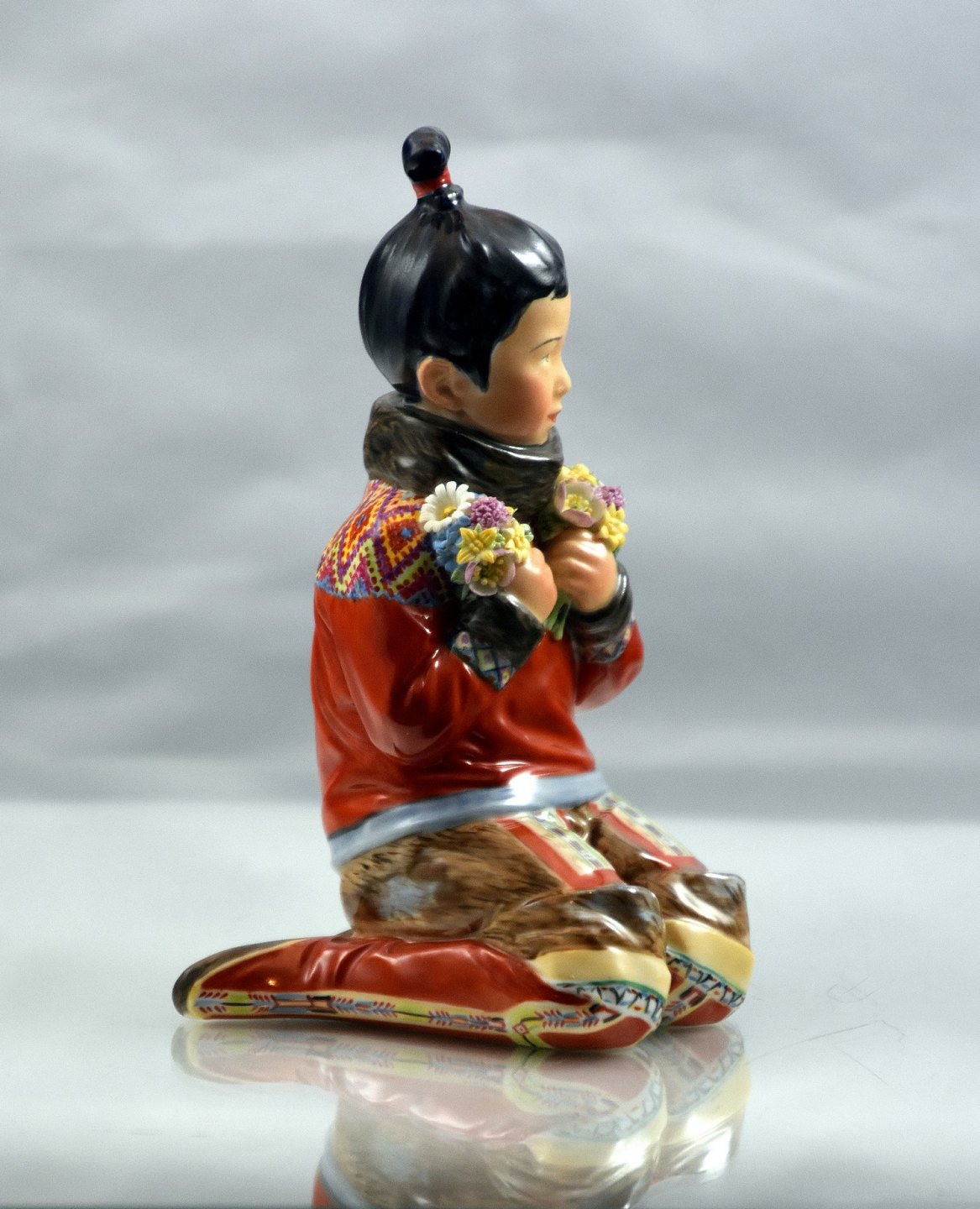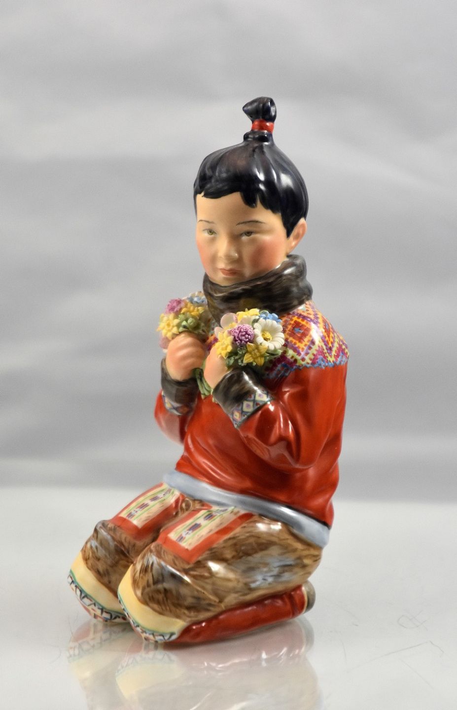 Kongelig figur af Grønlandskkvinde i nationaldragt. Hun sidder med blomster i hænderne. Den kongelig, kgl figur er overglasseret.