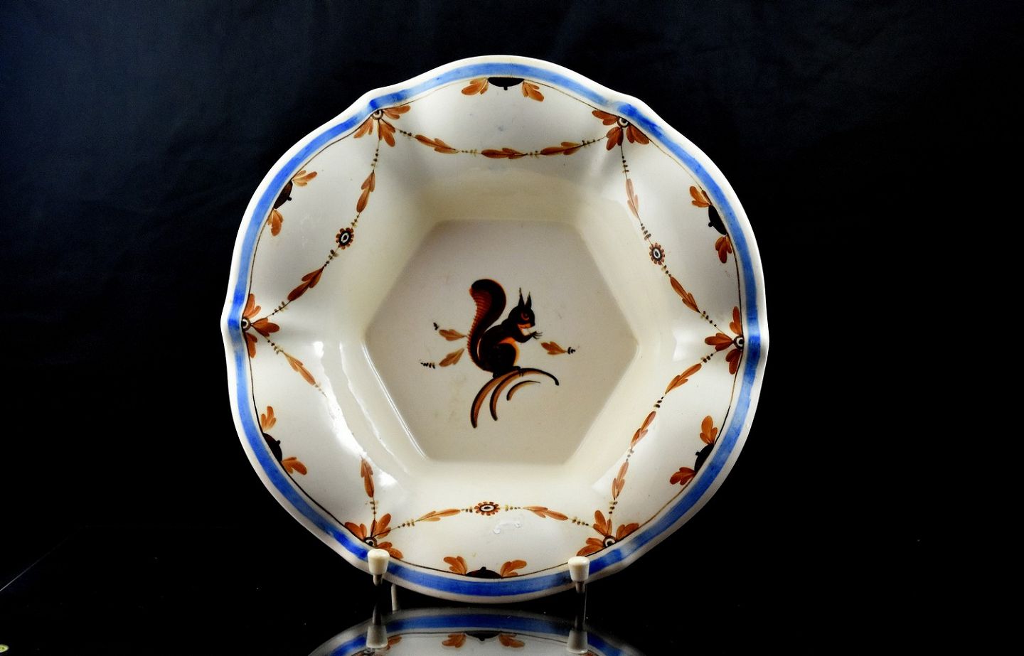 Rundt fajancefad fra Kgl./Aluminia, dekoreret med egern i bunden, der er en blå bølget kant på fadet (1436/1012) ja mystisk ligner kunstserien Efterår af Nils Thorsson, 1925-29, men kan ikke finde den på listen.