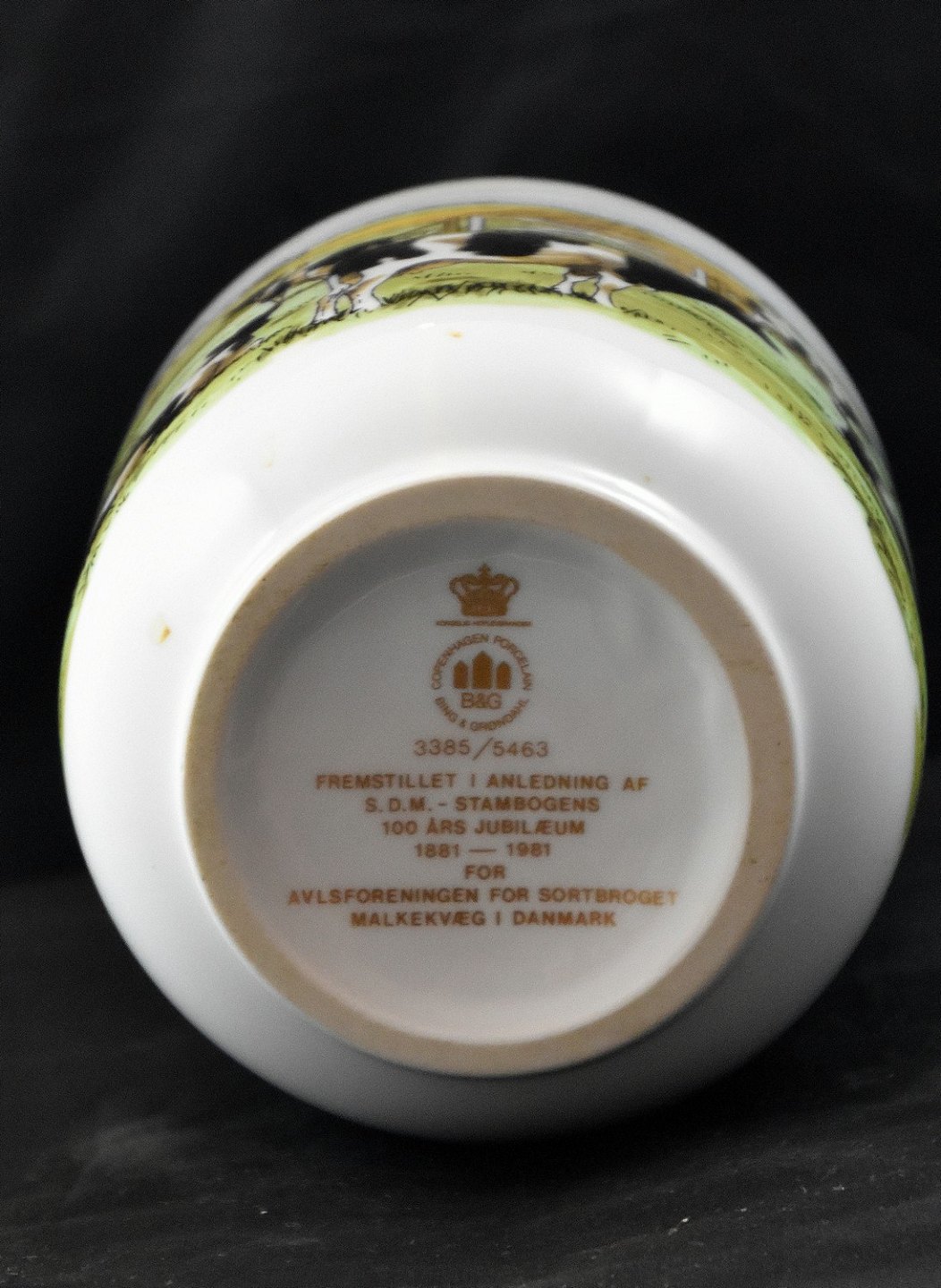 Bing & Grøndahl, vase( 3385/5463). Fremstillet i anledning af S:D:M:-Stambogsforenings 100 års-jubilæum 1881-1981. Avlsforeningen for sortbroget malkekvæg