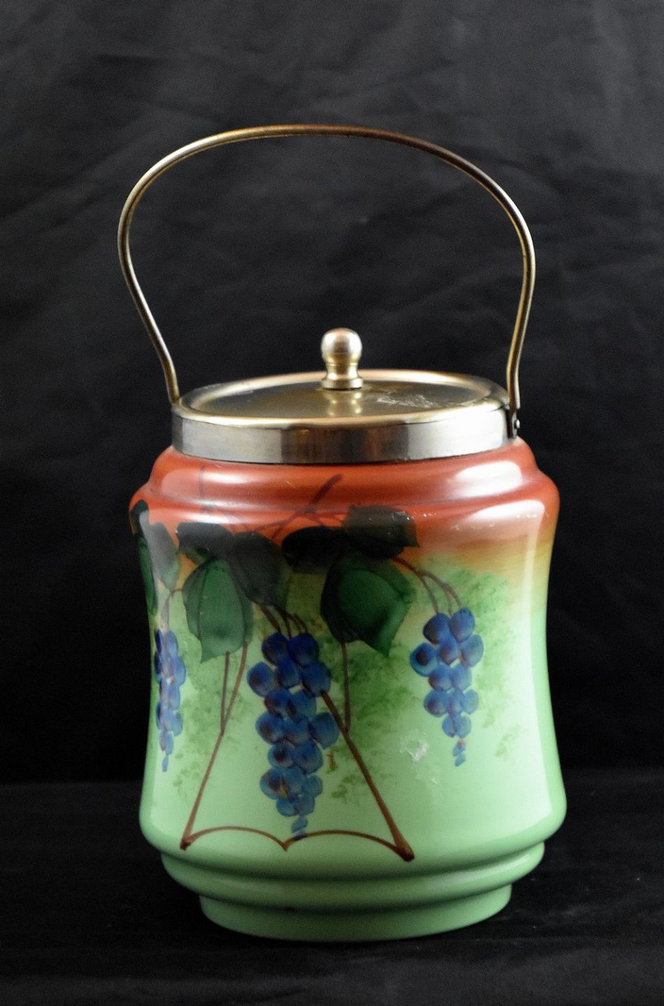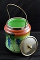 Grøn glas kiksespand, med dekoration af druer. Hank og låg er af stål