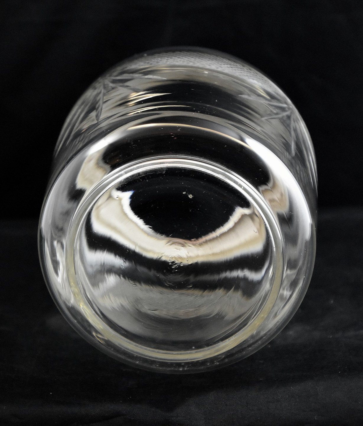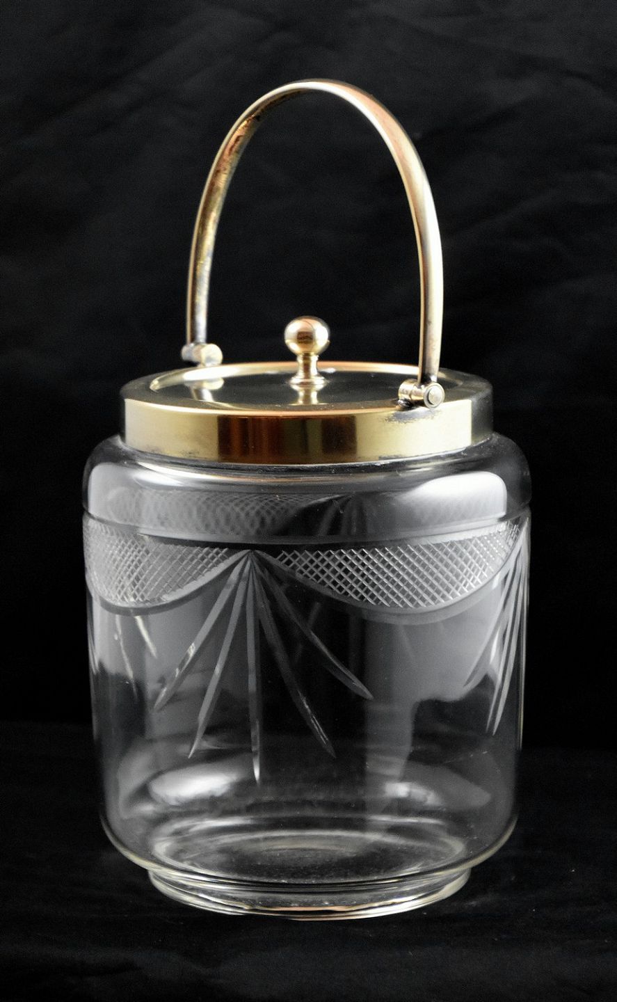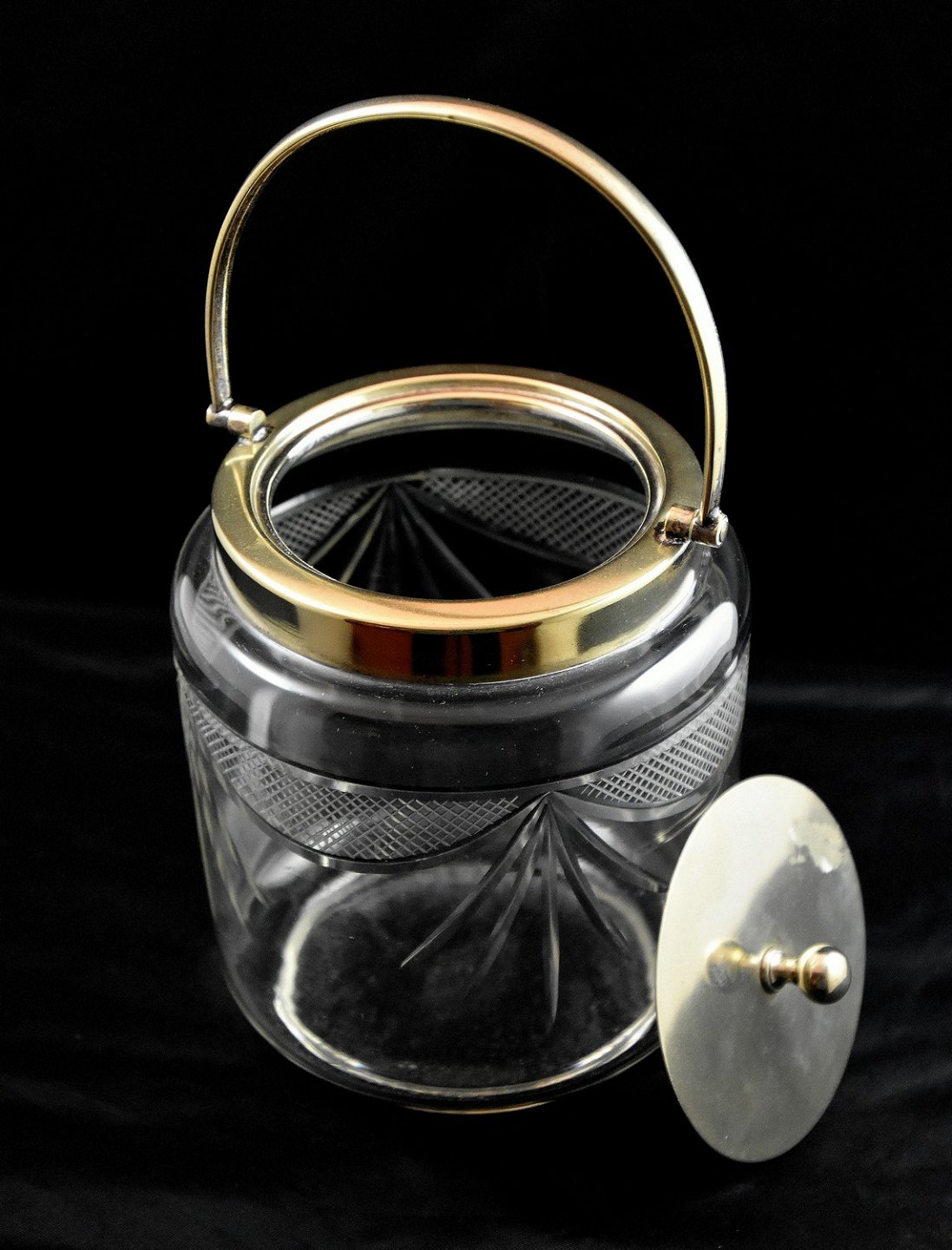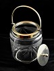 Kiksespand, af klart glas, med empire slebet mønster. Hank og låg er af stål