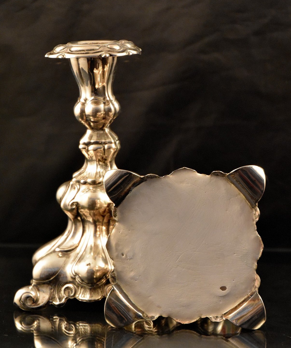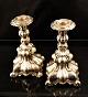 2 sølvlysestager på 4-kantet fod i rokoko-stil. Stemplet 3 tårnet, JS for Jens Sigsgaard, og samlet vægt 1122 gram