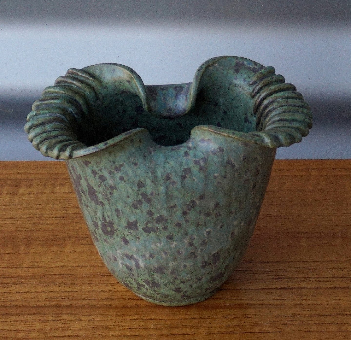 Arne Bang vase med grønlig glassur og brune pletter i den grønlige glassur i flot stand