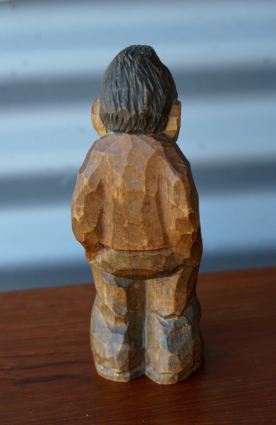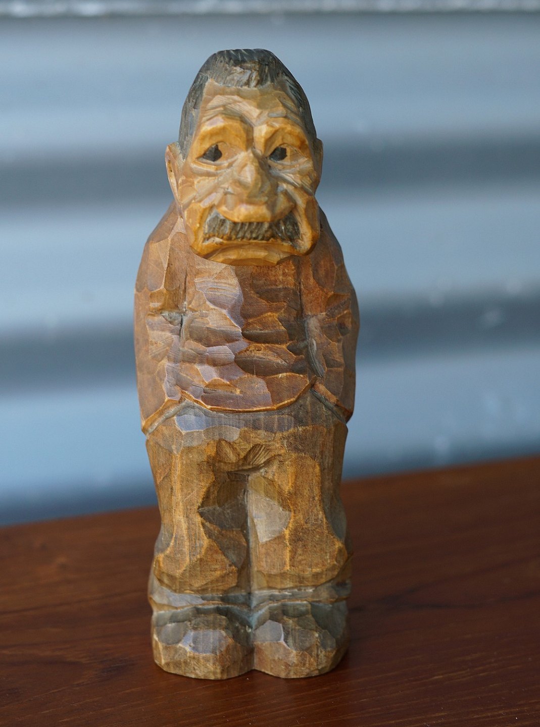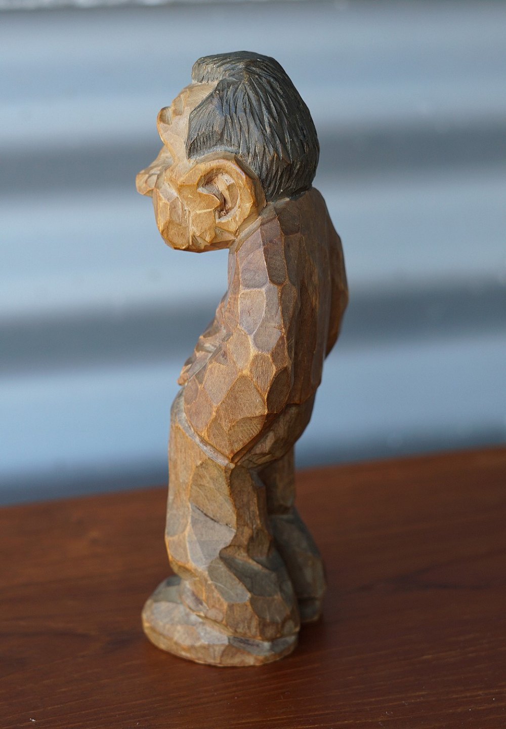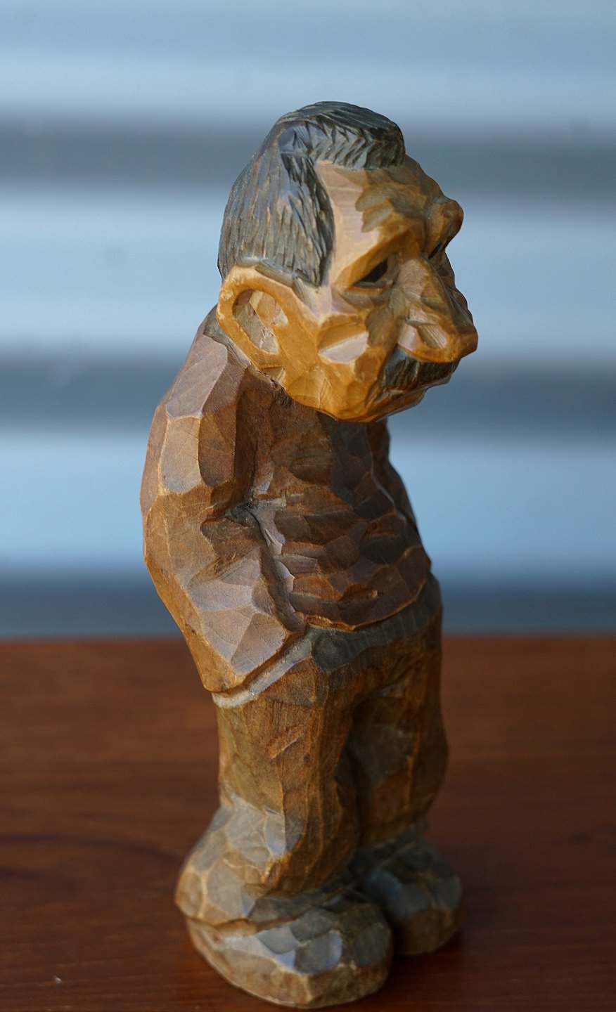 Træfigur af mand med hånden i lommen. Tidlig træskærer arbejde af Thomas Dam, mærket DAM, sort farvet hår og skæg.