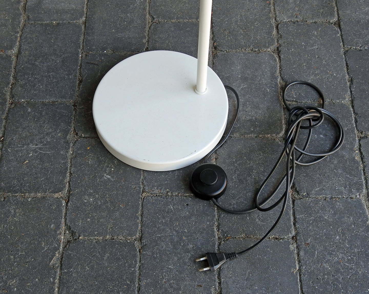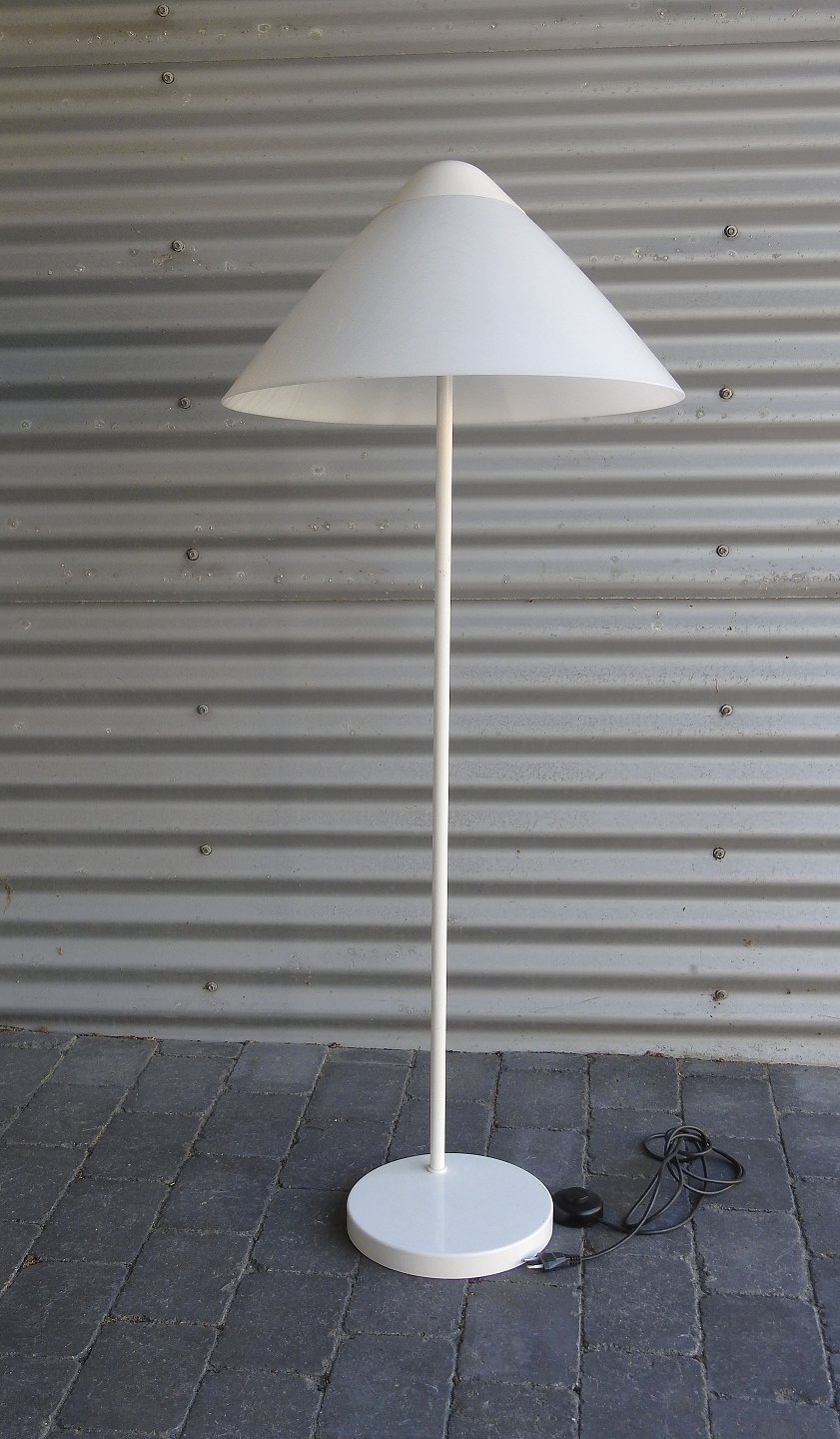 Opala Standerlampe med oval skærm designet af Hans J. Wegner. Skærmen er i opalhvid plast på hvidlakeret metalfod. Fremstår med enkelte brugsspor på fod.