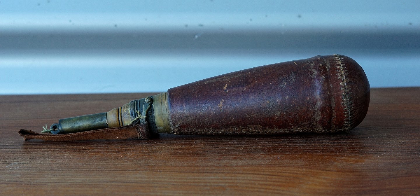 Krudthorn, i læder med messing top. Krudthornet er til jægeren når han på jagten skal genlade.