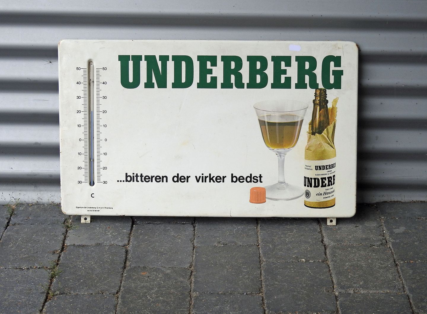 Metalskilt fra Underberg Bitter med termometer. Fremstår med brugsspor.