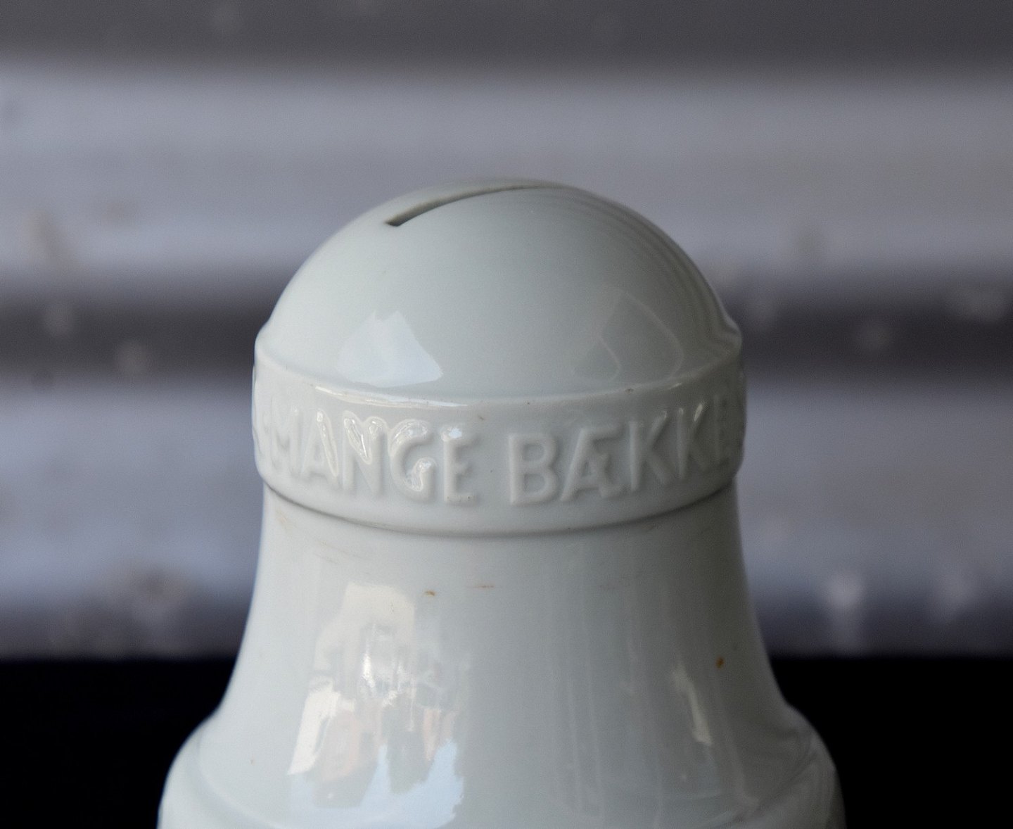 Gammel sparebøsse i mintgrøn porcelæn i form af en klokke