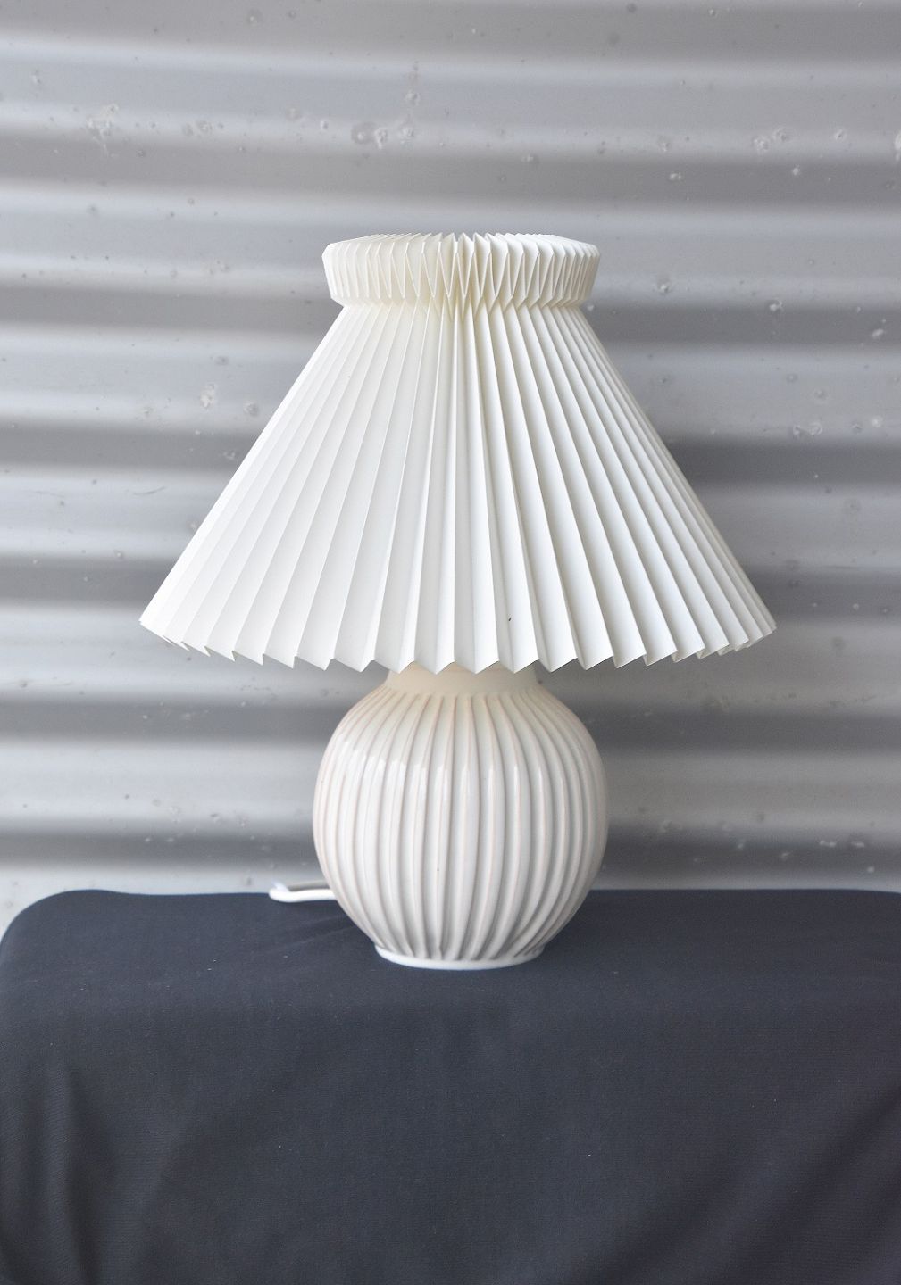 Hvid riflet bordlampe i keramik, Eslau lignende med Le Klint skærm.