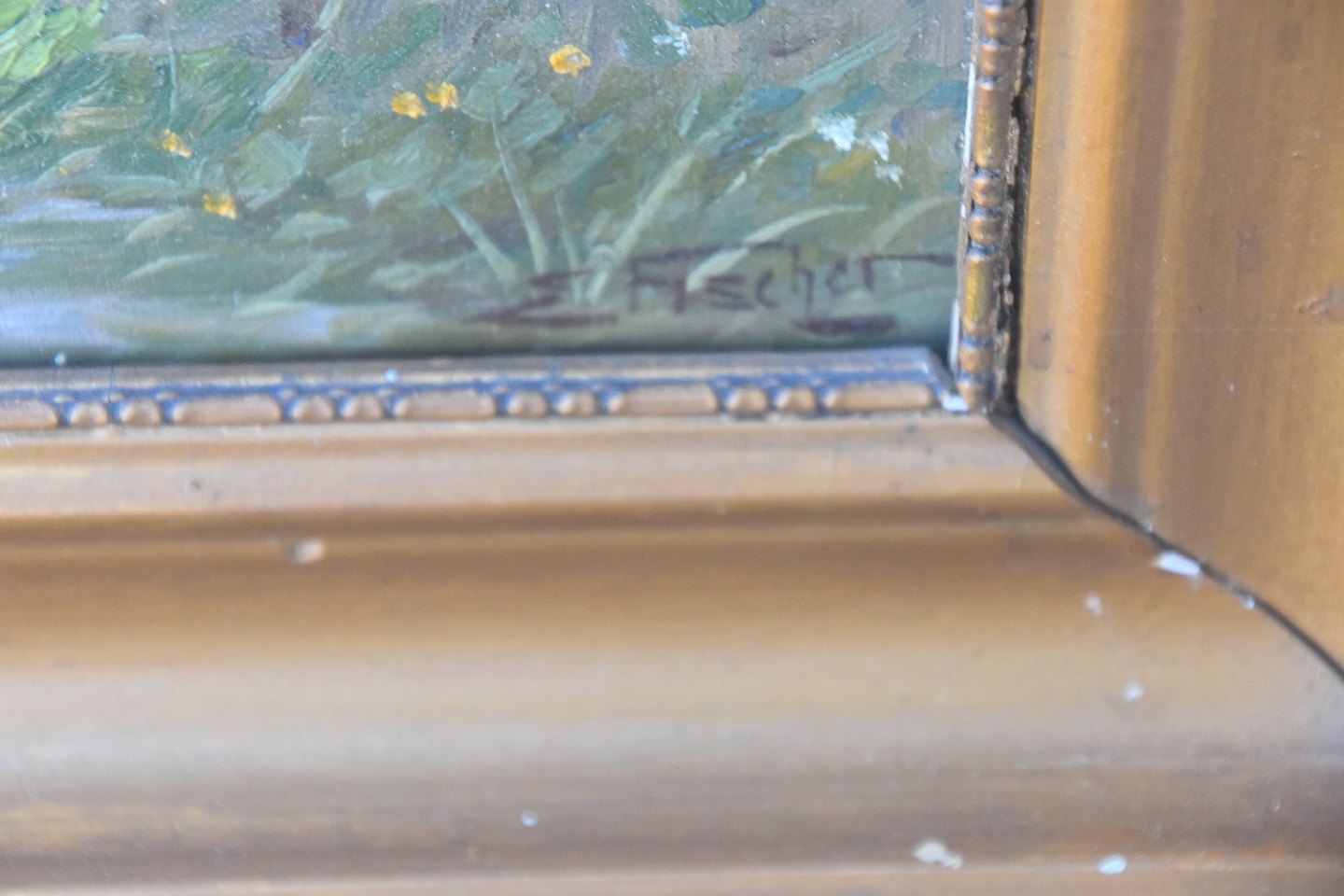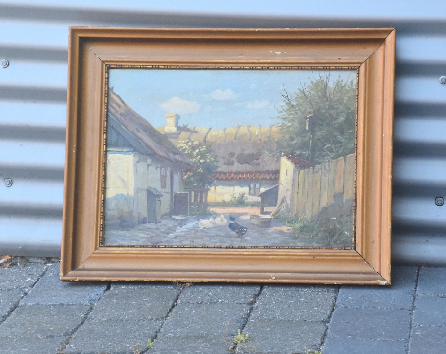 Maleri af Edmund Fischer. Gårdsplads med ænder.