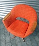 Lænestol i orange stof med armlæn og fod i teaktræ