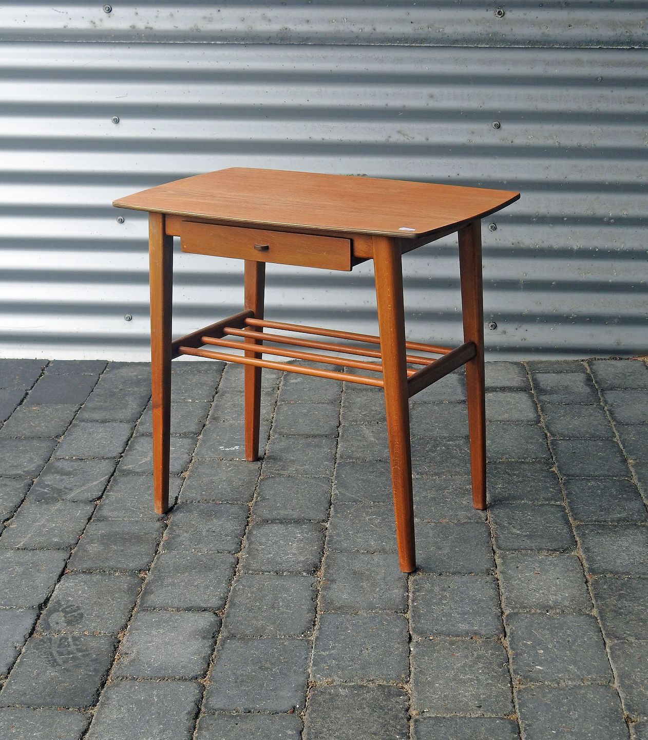 Entremøbel med teak plade og lakeret bøg med skuffe og hylde