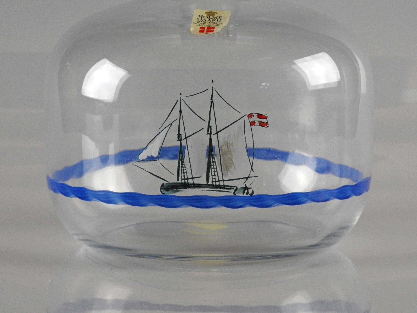 Glasflasken har dekoration af skib og måger. Flasken kommer med korkprop.