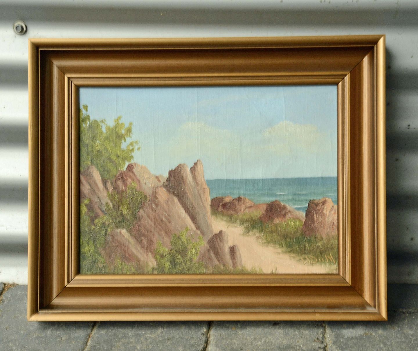 Landskabsmaleri med motiv af sti og sten af Hans Dahl.