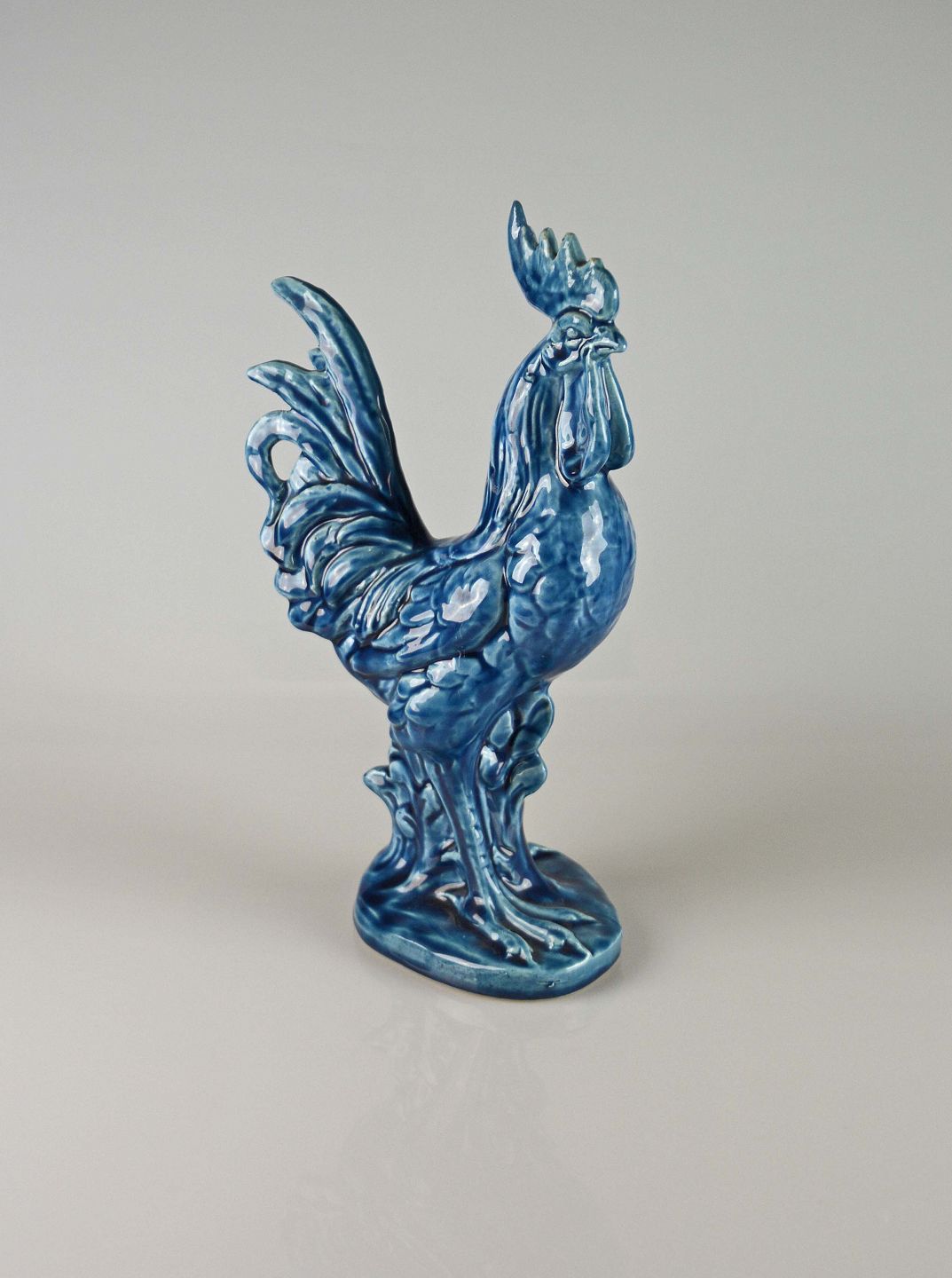 Figur af hane i blåglaseret keramik