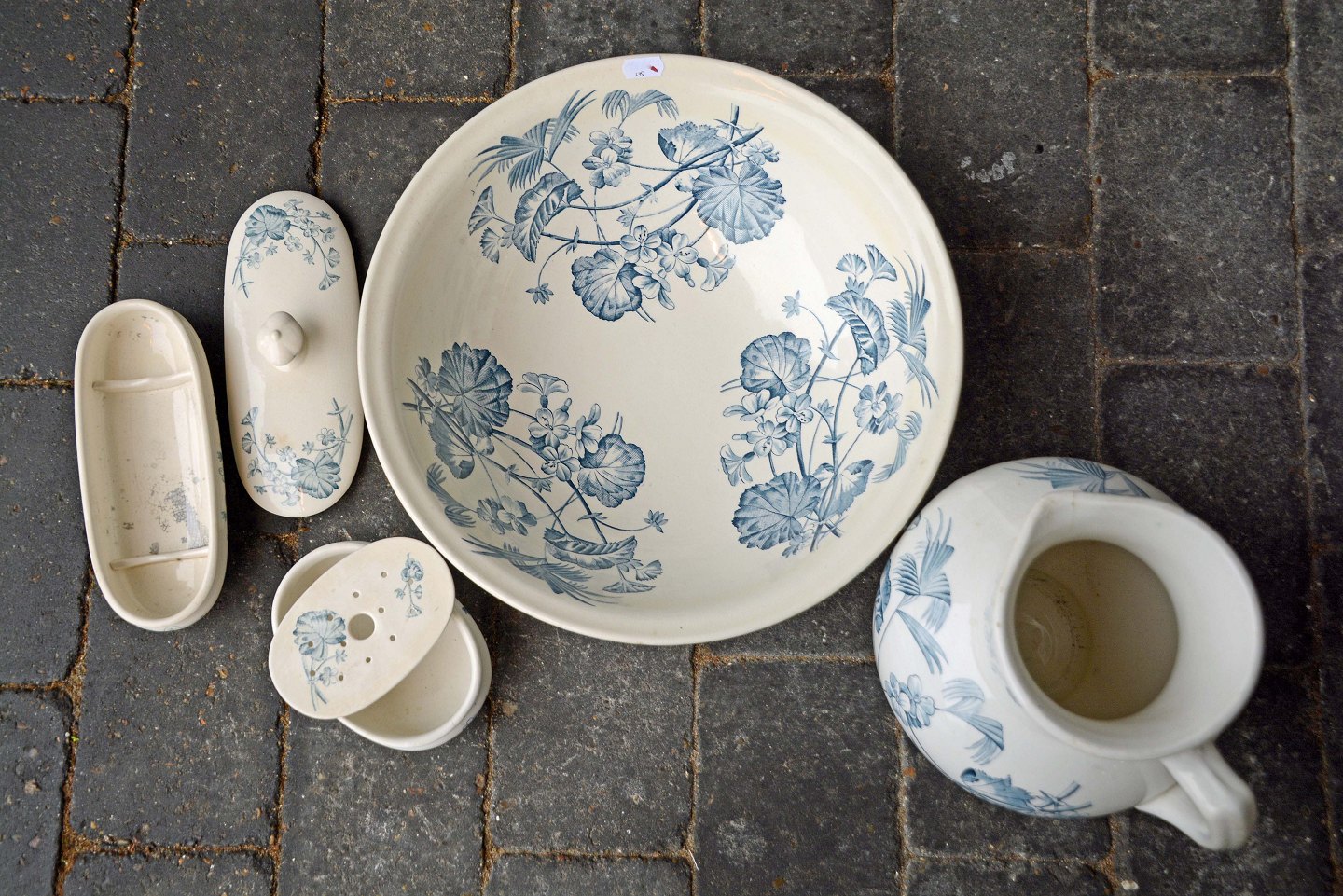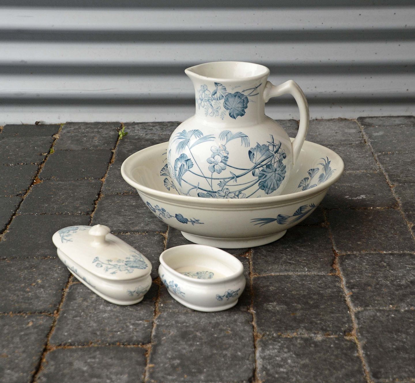 Sættet består af vandfad med kande, sæbeskål med insats og aflang lågkrukke.