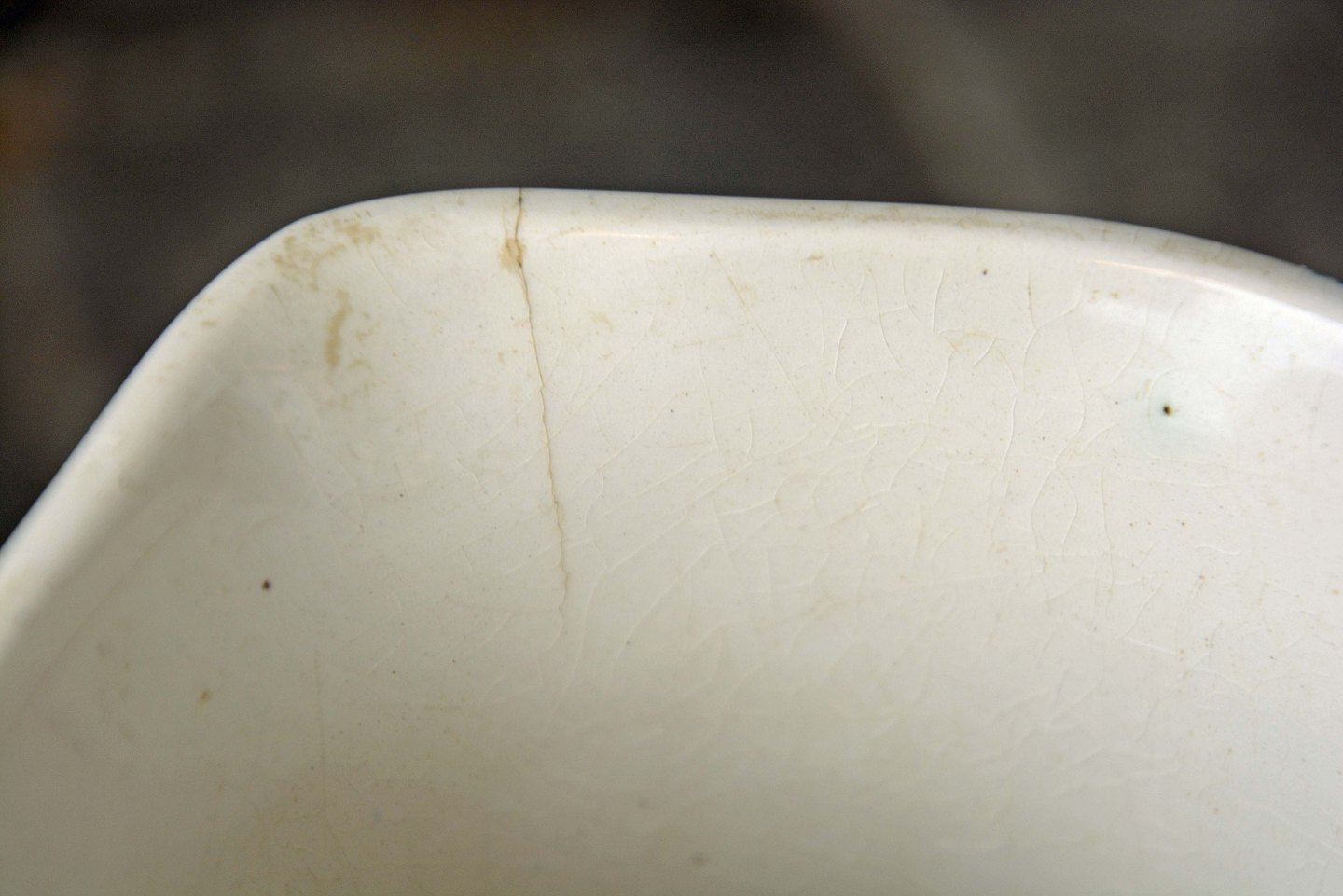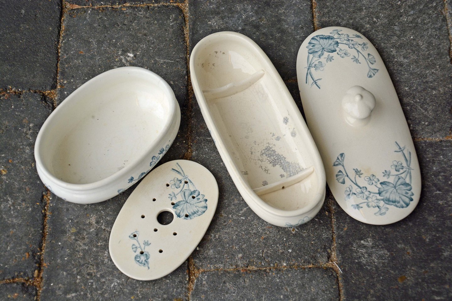 Sættet fremstår med overfladiske nøk i glasuren, hårfinrevne ved kandetud og på sæbeskål.
