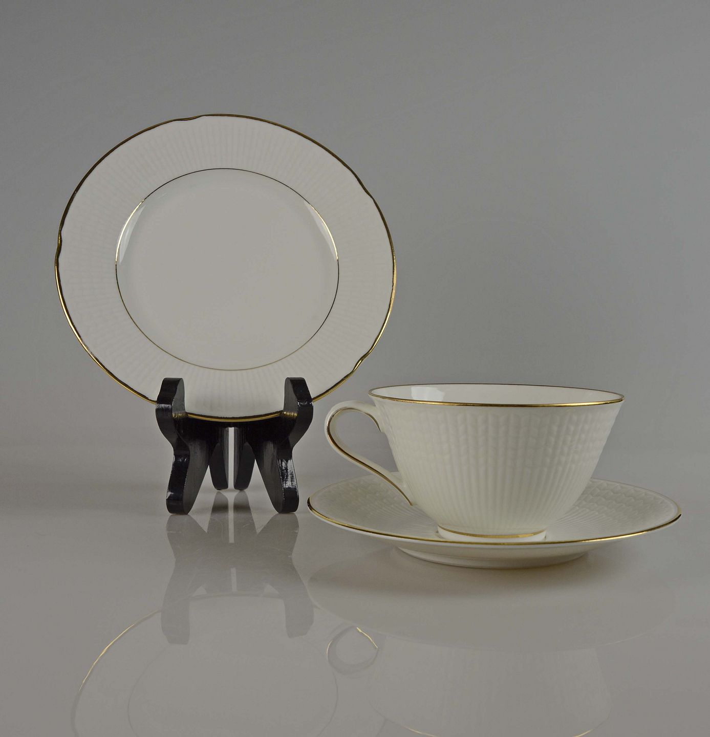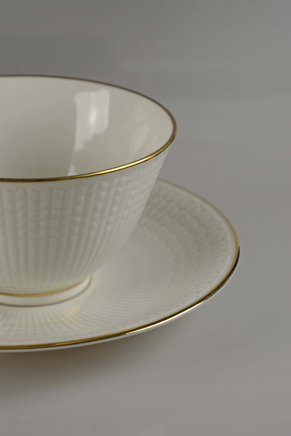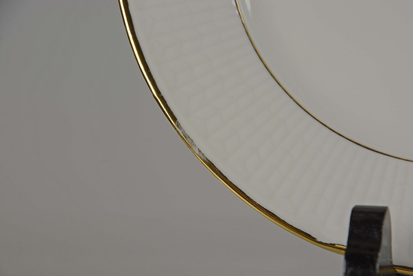 Hvidt porcelæn med sildebensmønster og gylden kant.