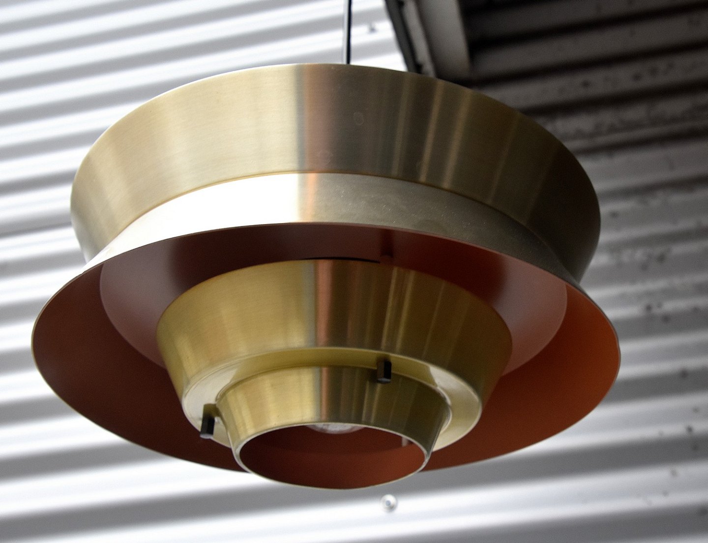 Messing pendel, der er lakeret orange indvendig. Carl Thora
