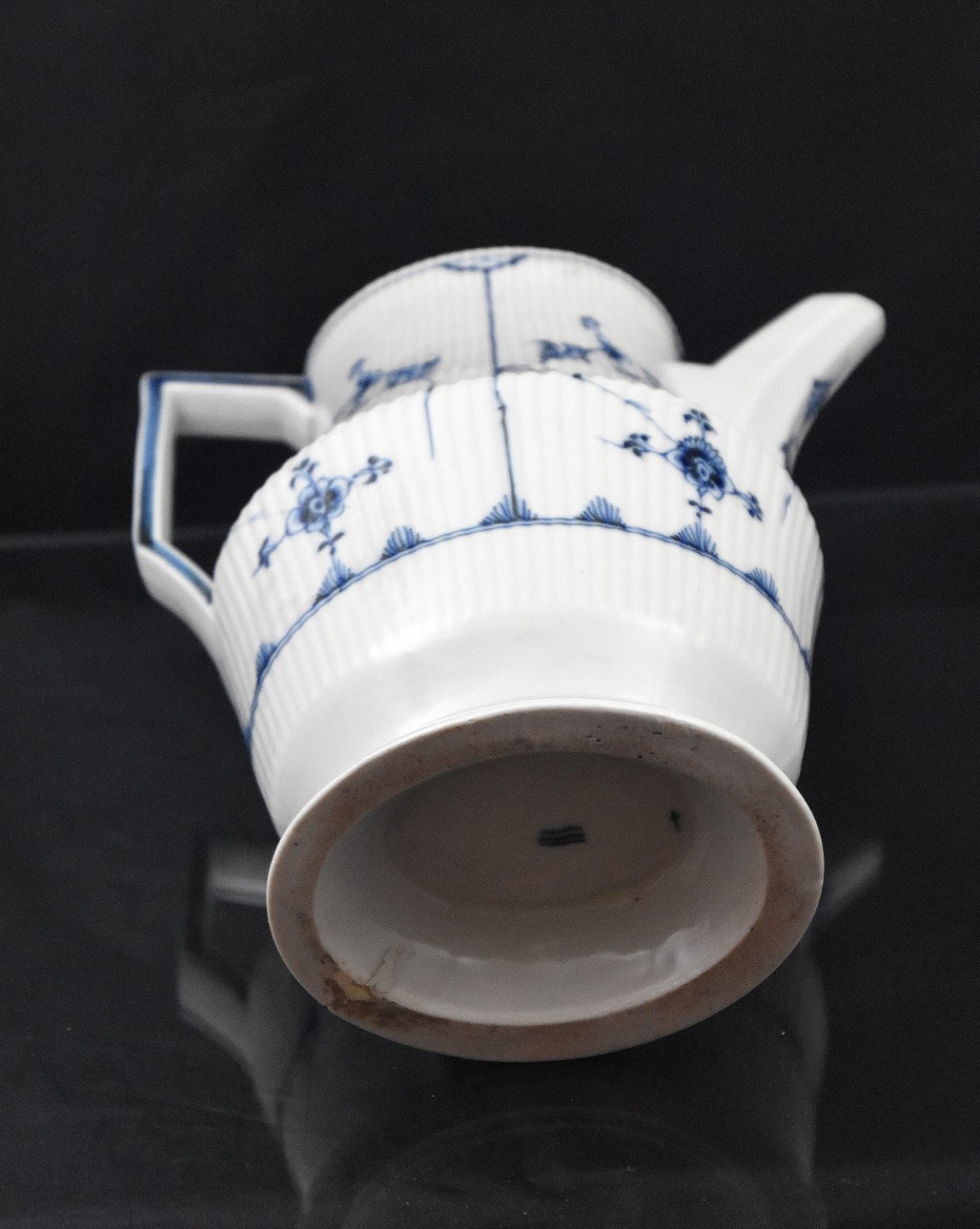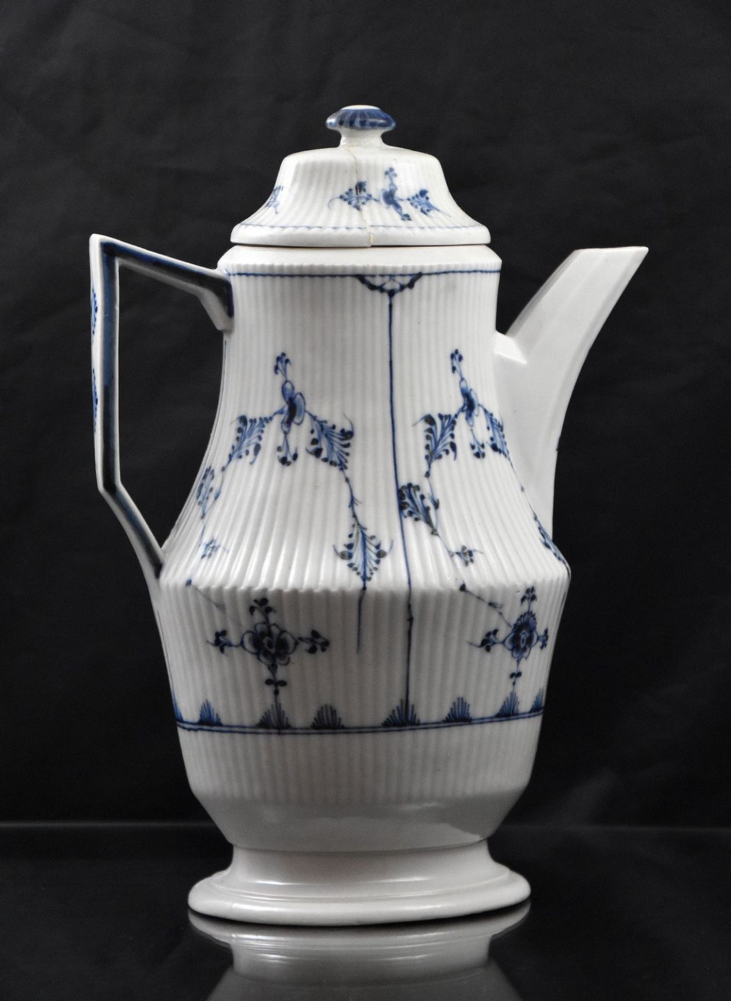 Kaffe kande i musselmalet fra ca 1800, Den Kongelig porcelænsfabrik. Kanden er oval. Kaffekanden har flere brugsspor og er klinket et par gange i låg