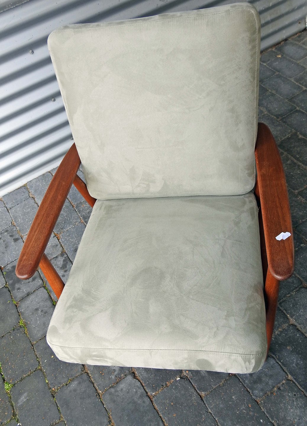 Lænestol i teaktræ med polstret sæde med gråt stofbetræk, betræk og polstring i god stand.