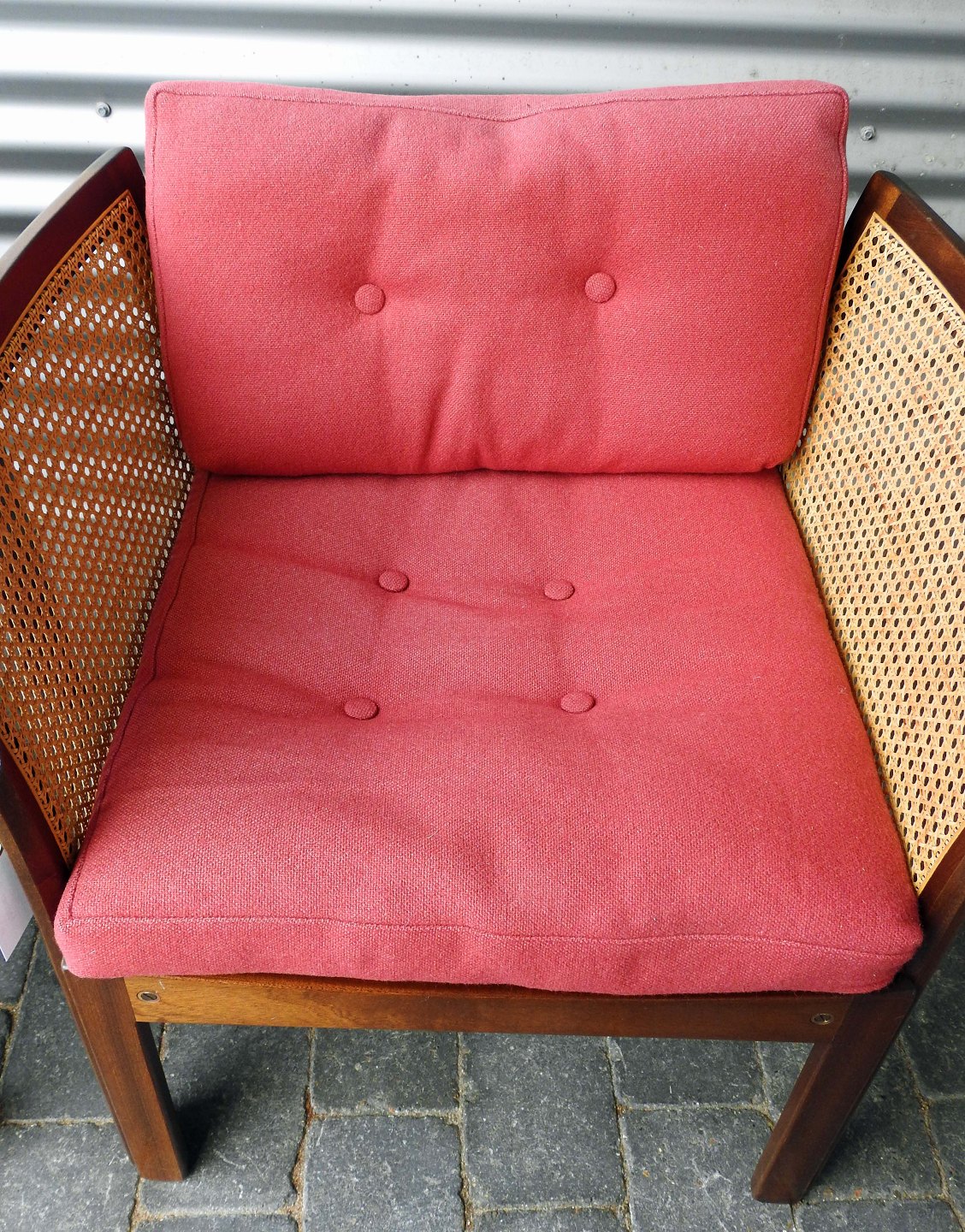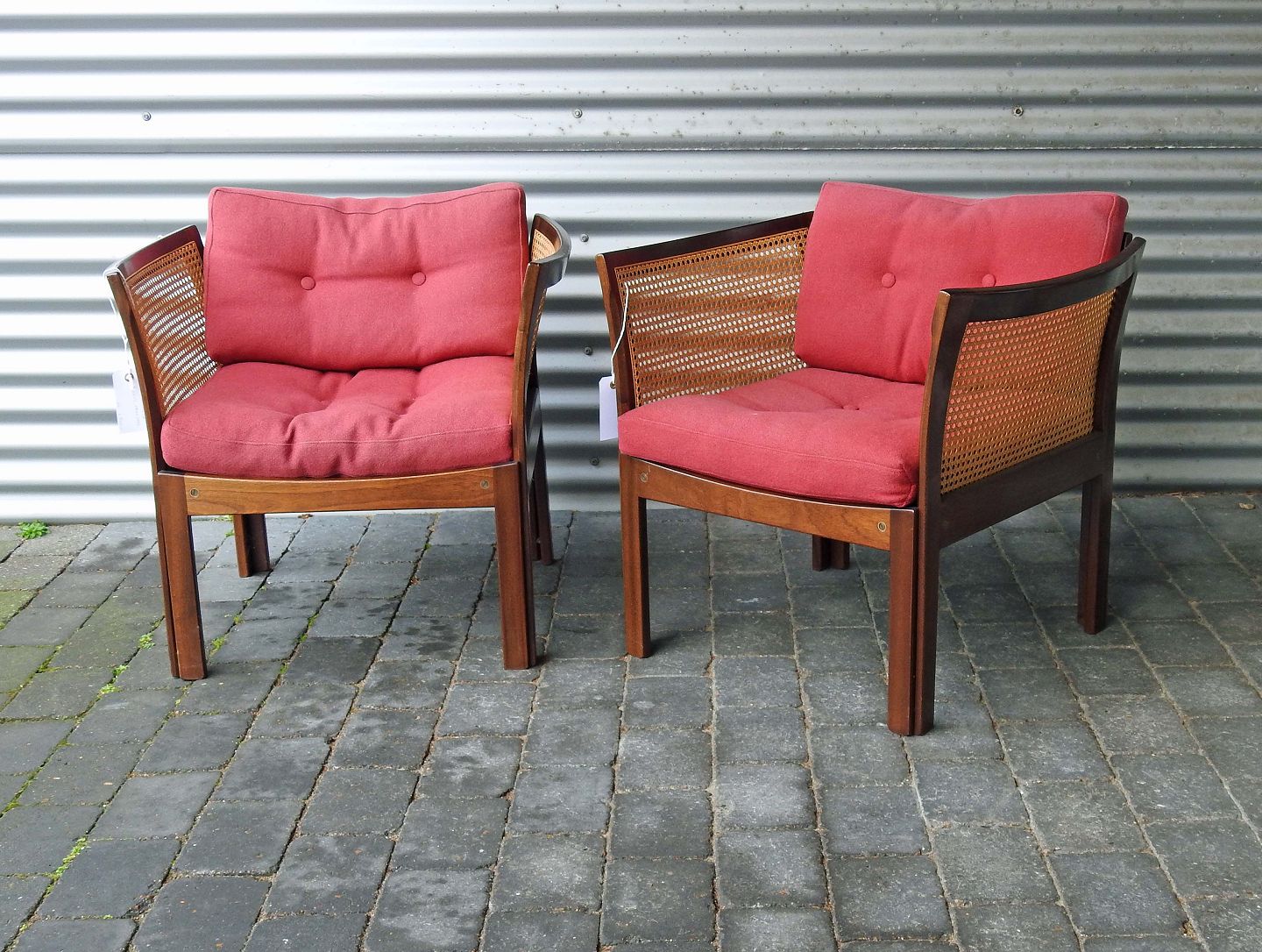 Plexus lænestole (2 stk) med rødt stofbetrukket sæde og ryglæn