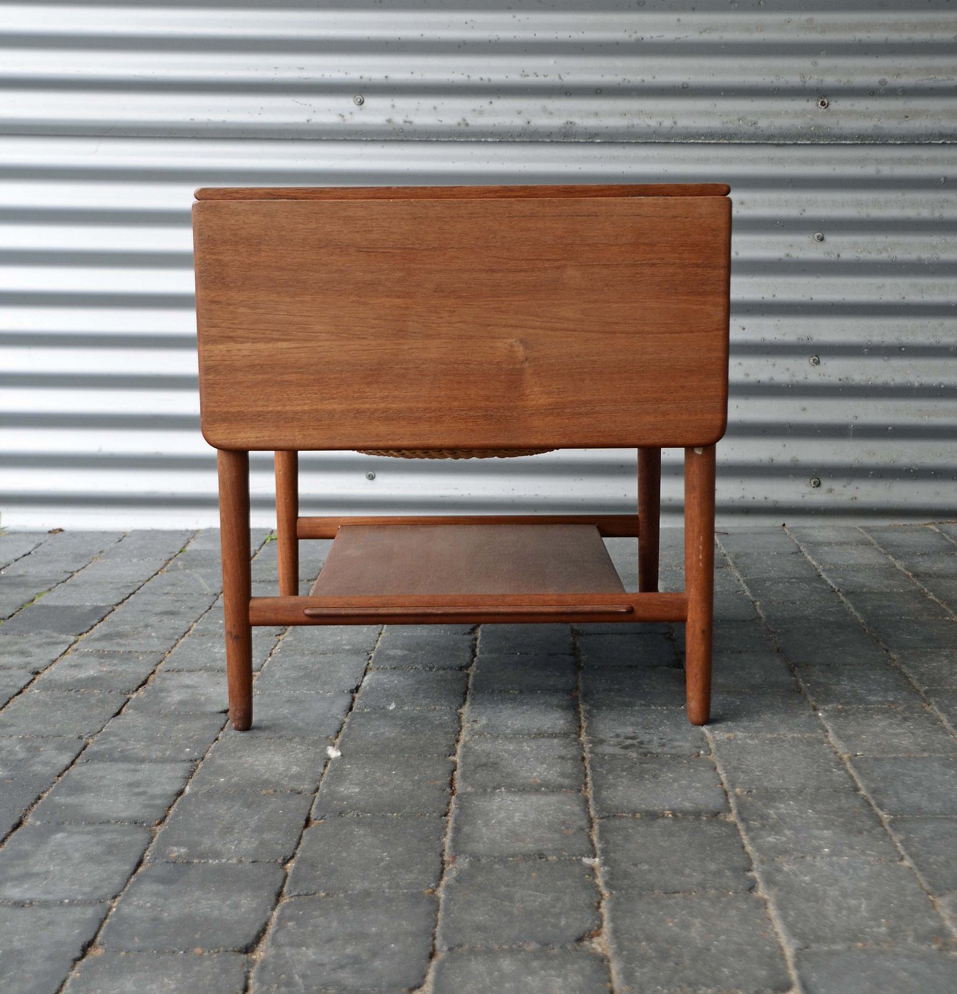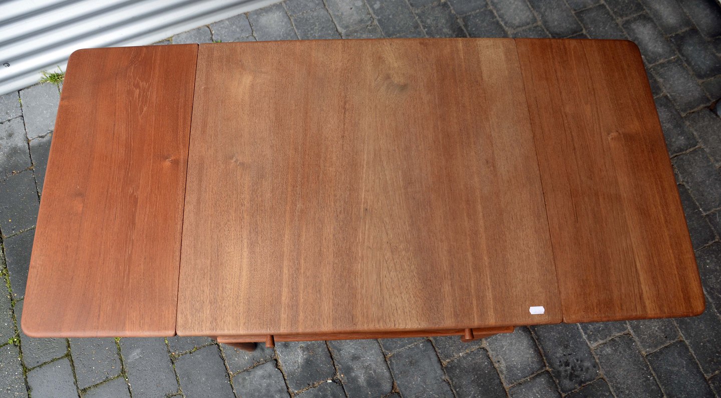 Sybord i teak, designet af Hans J Wegner. Alt er i teak på nær det indvendige af skuffen.