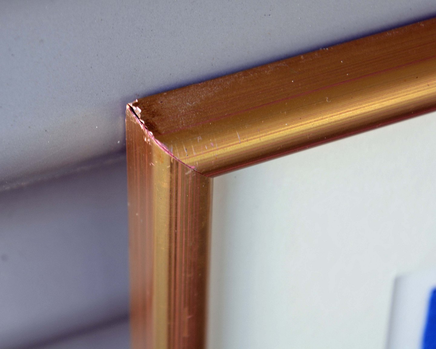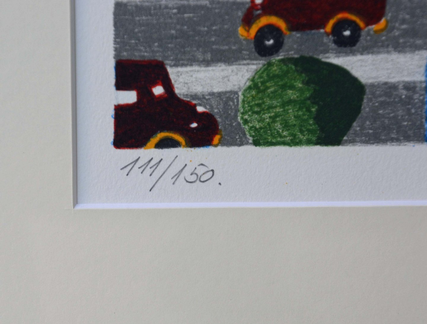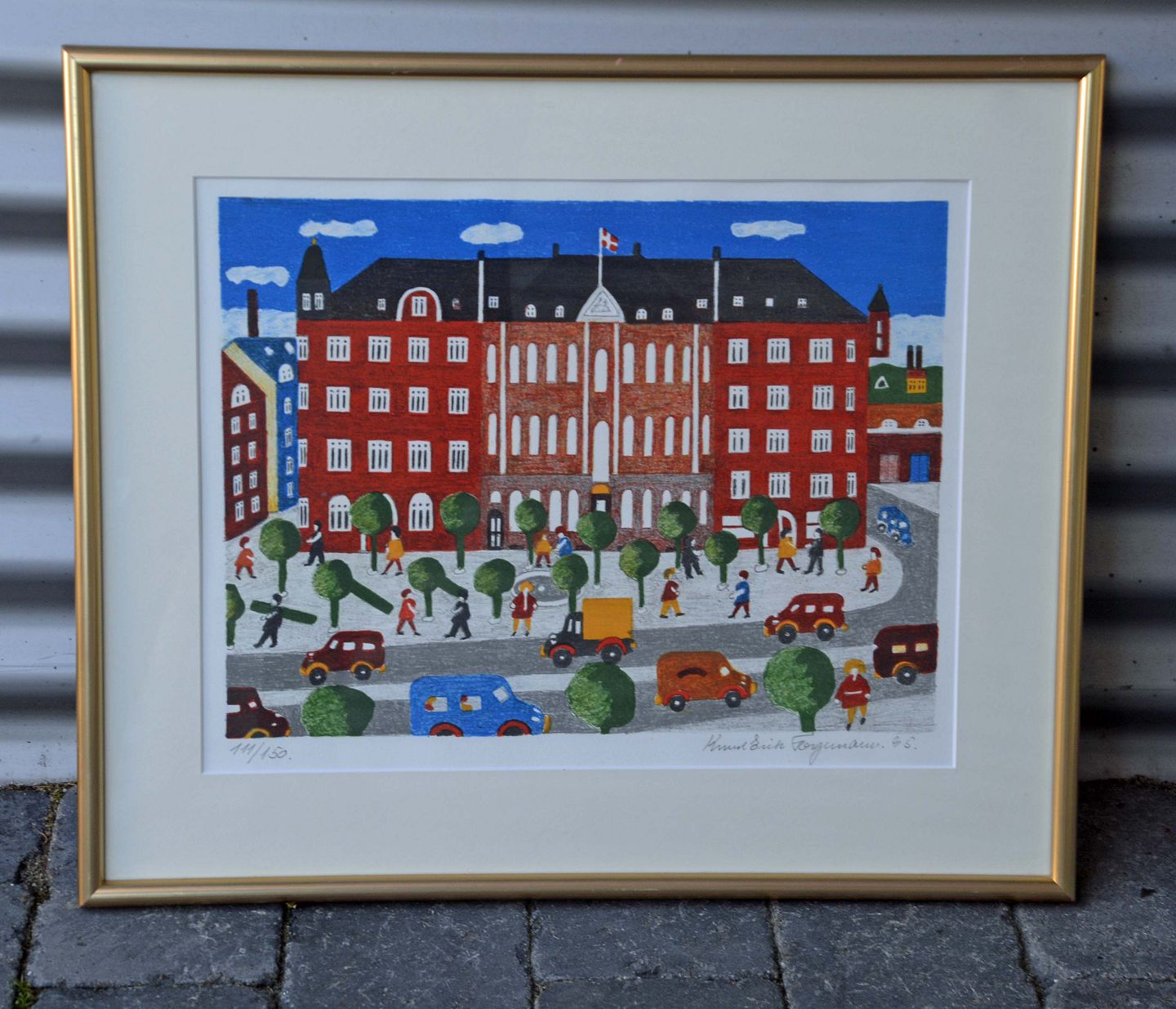 Litografi med motiv af bygninger og byliv af Knud Erik Færgemann