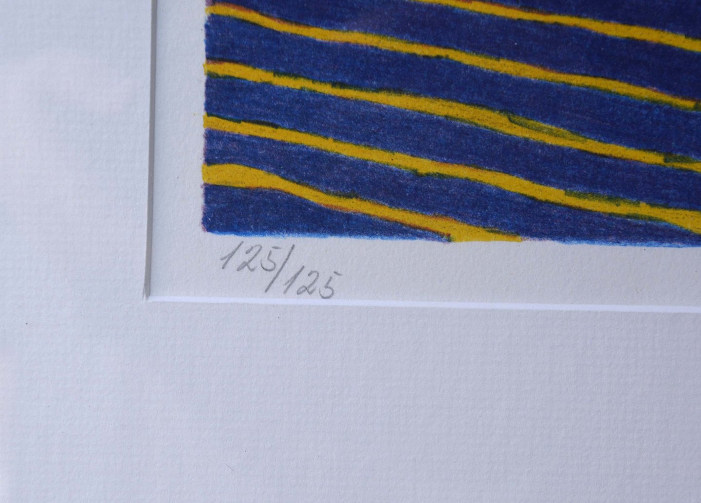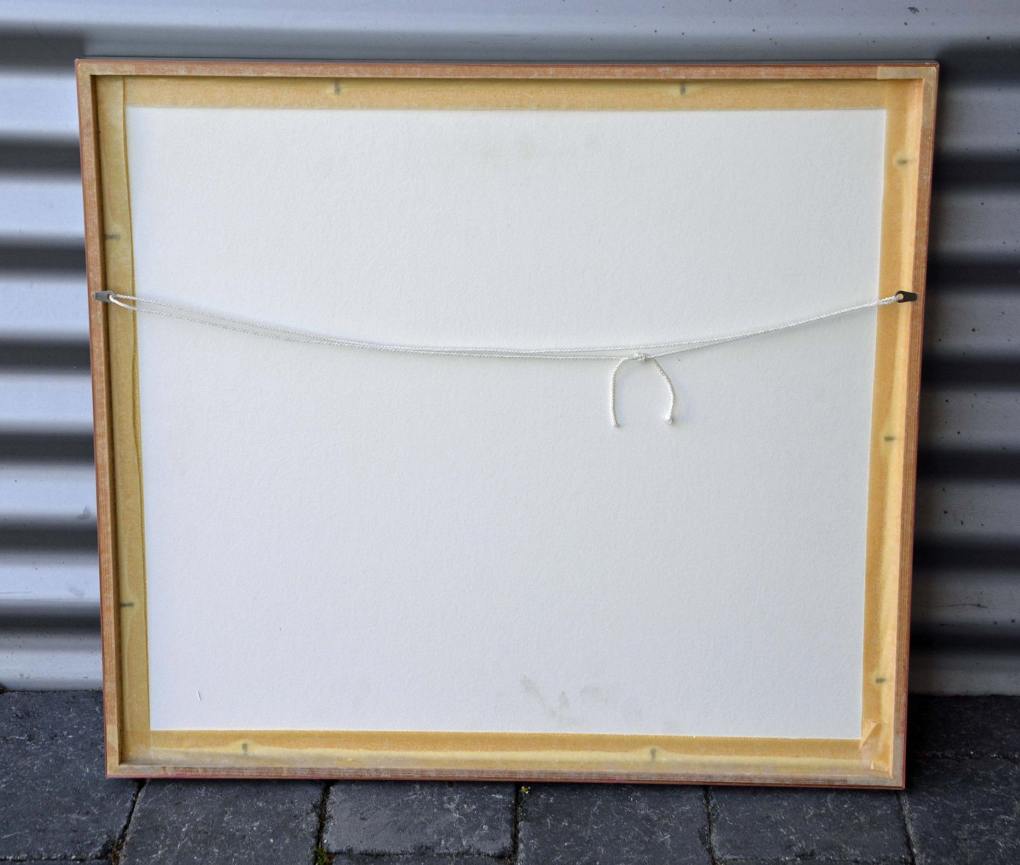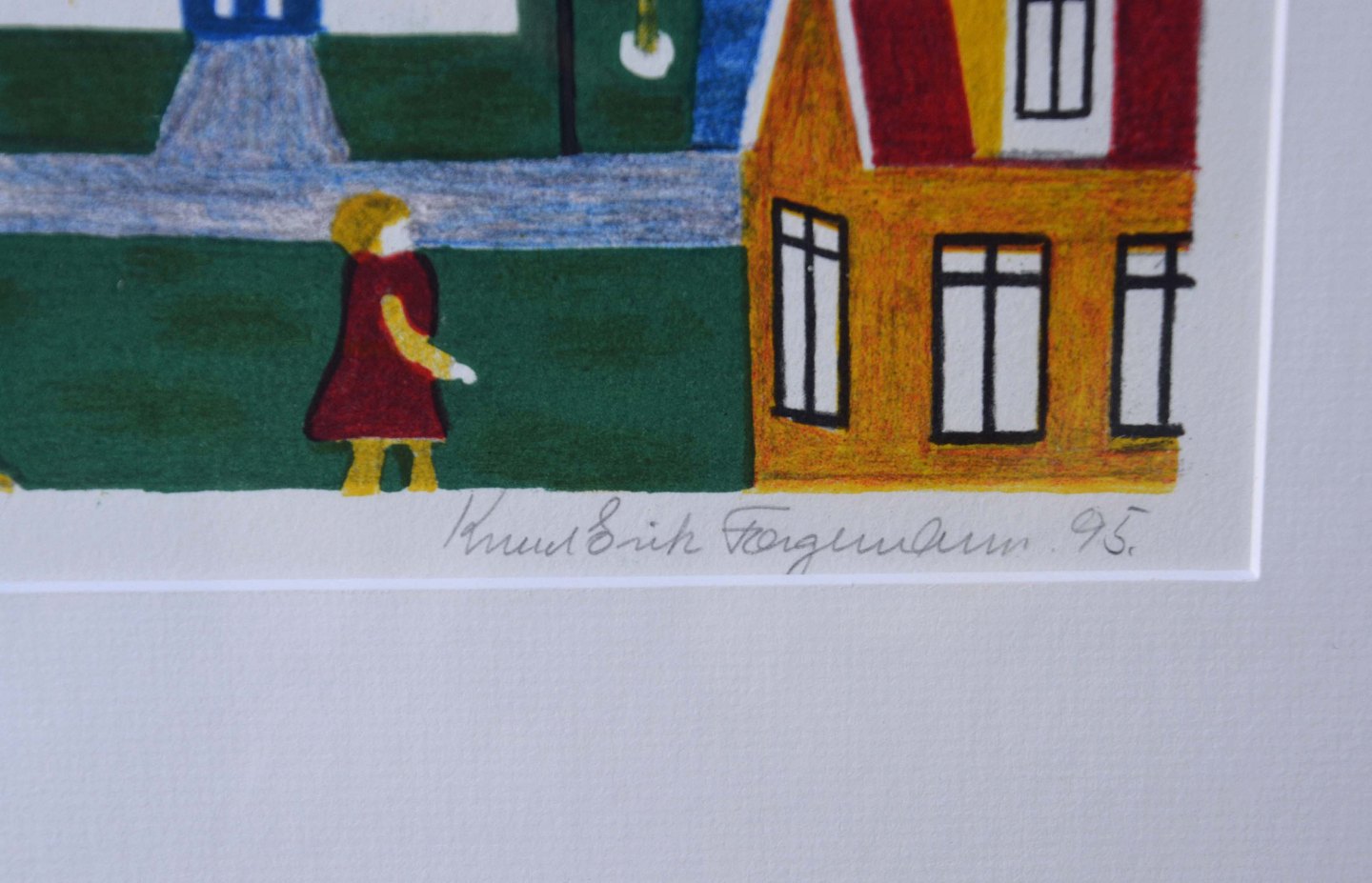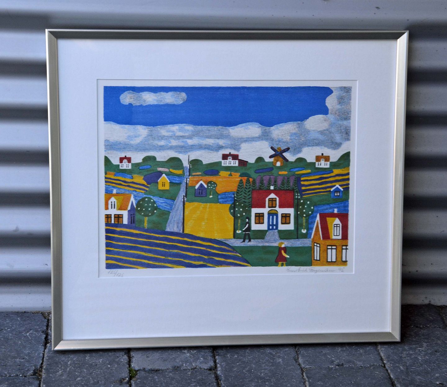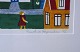 Litografi med motiv af bygninger og landsbyliv af Knud Erik Færgemann
