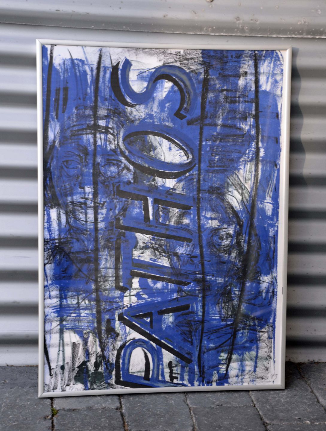 Litografi med skriften "Pathos" i blå og sorte nuancer af Erik A. Frandsen
