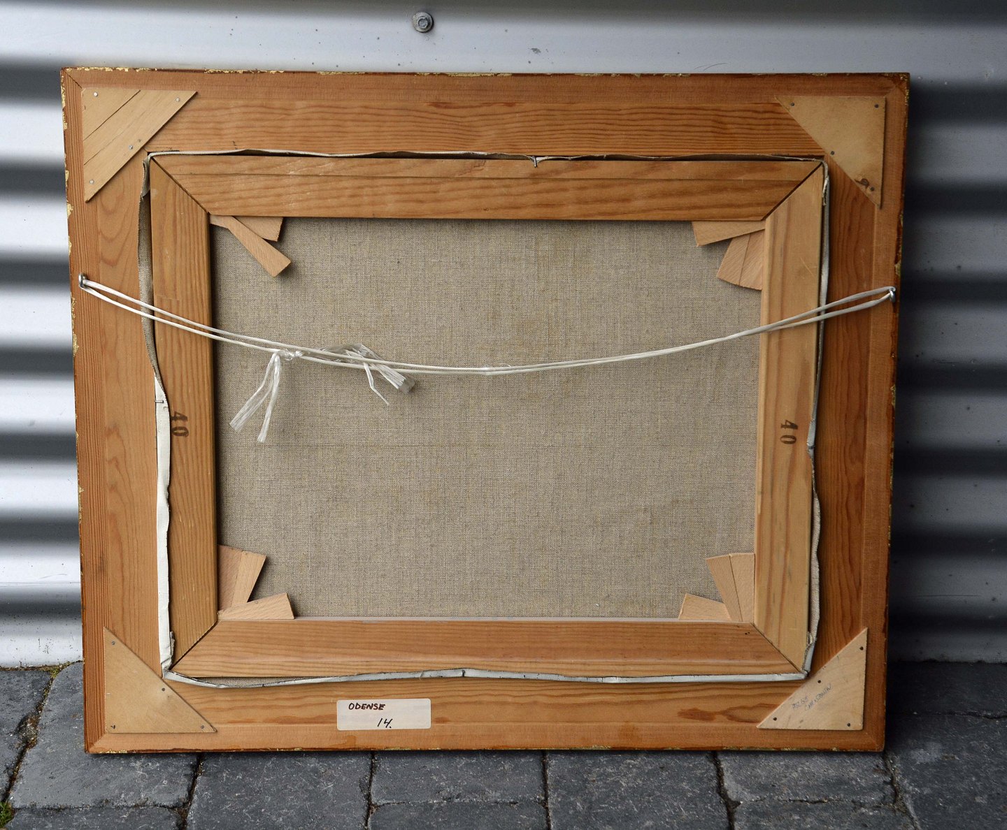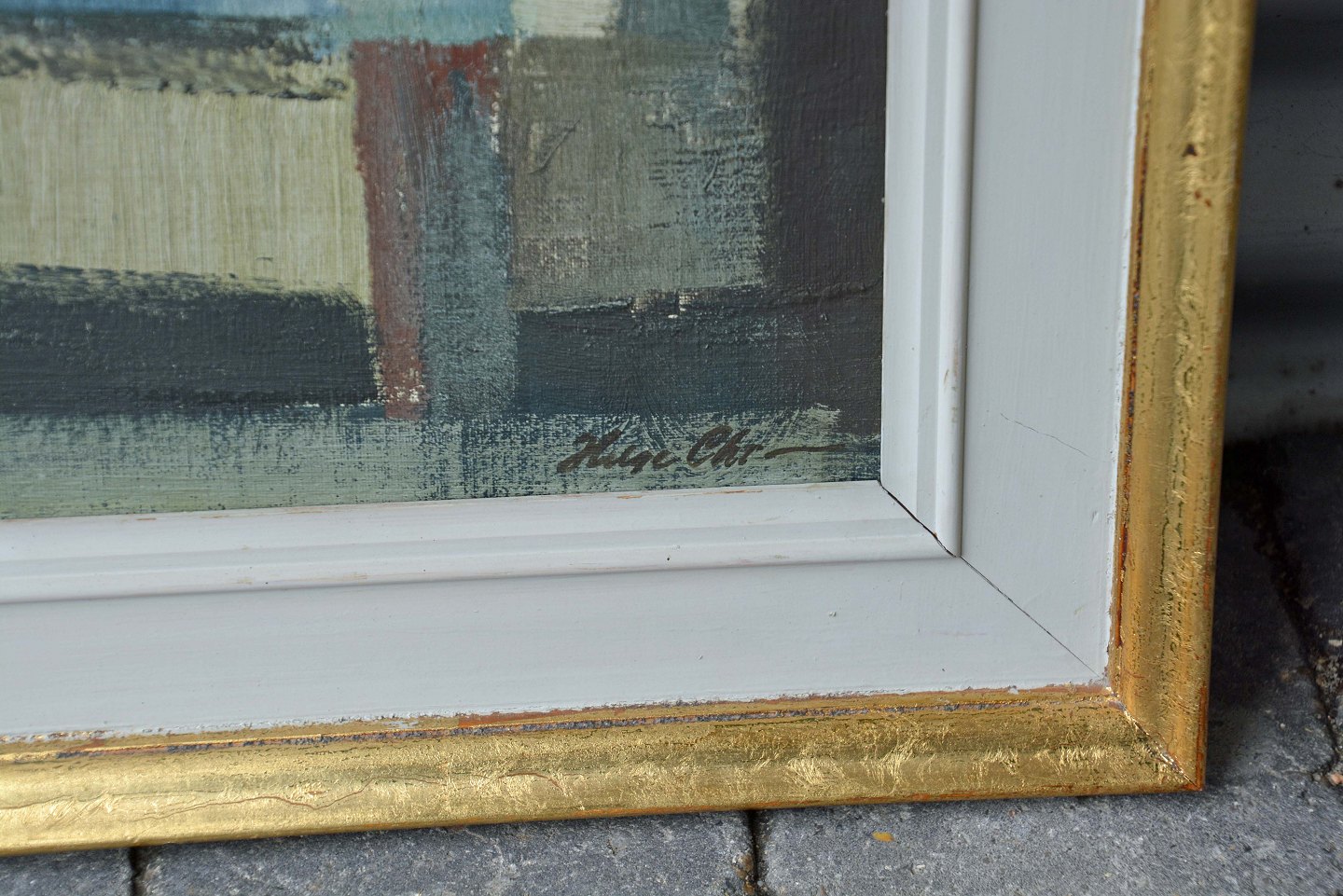 Skibsmaleri med motiv af skibe i havneområde af Helge Christensen
