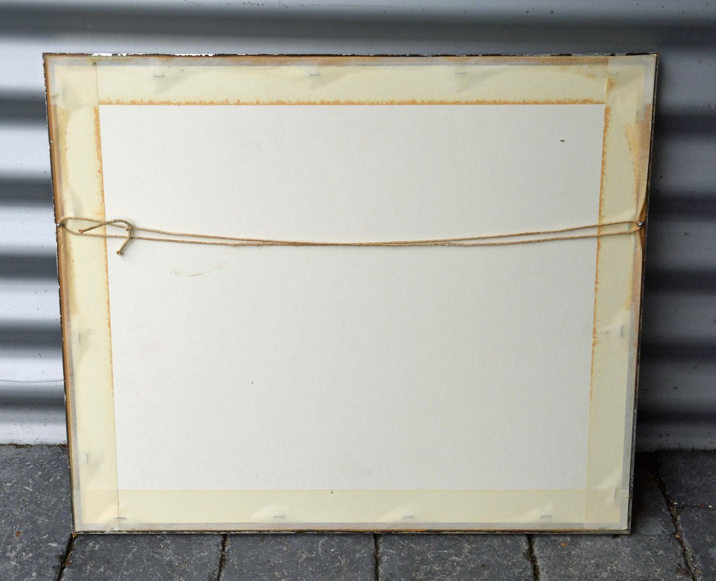 Indrammet træsnit i sølvmalet træramme med motiv af fiskebåd på land ved Frederikshavn