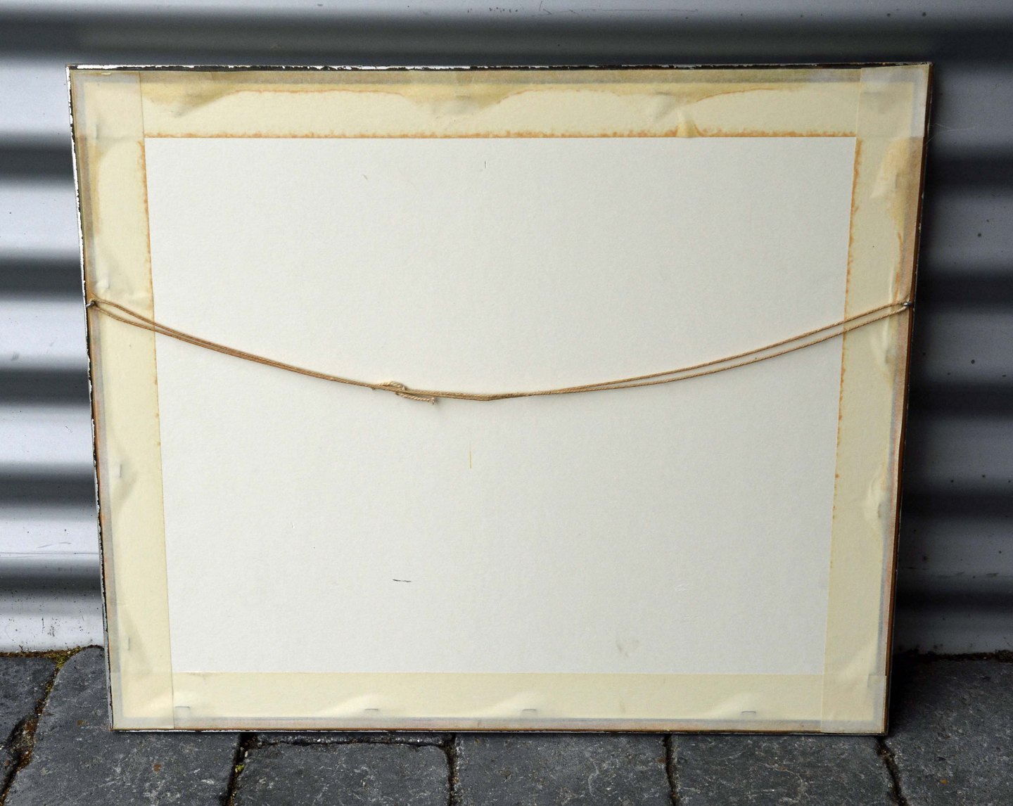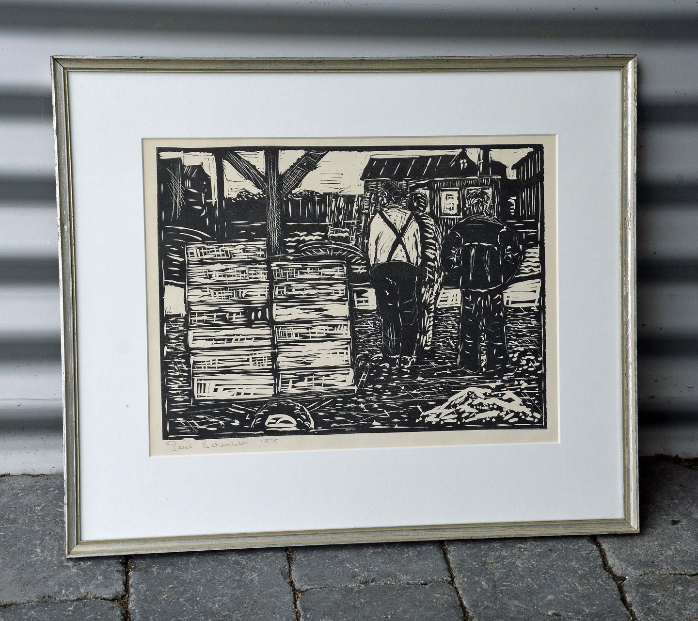 Indrammmet træsnit i sølvmalet træramme med motiv af mænd set bagfra ved fiskekasser