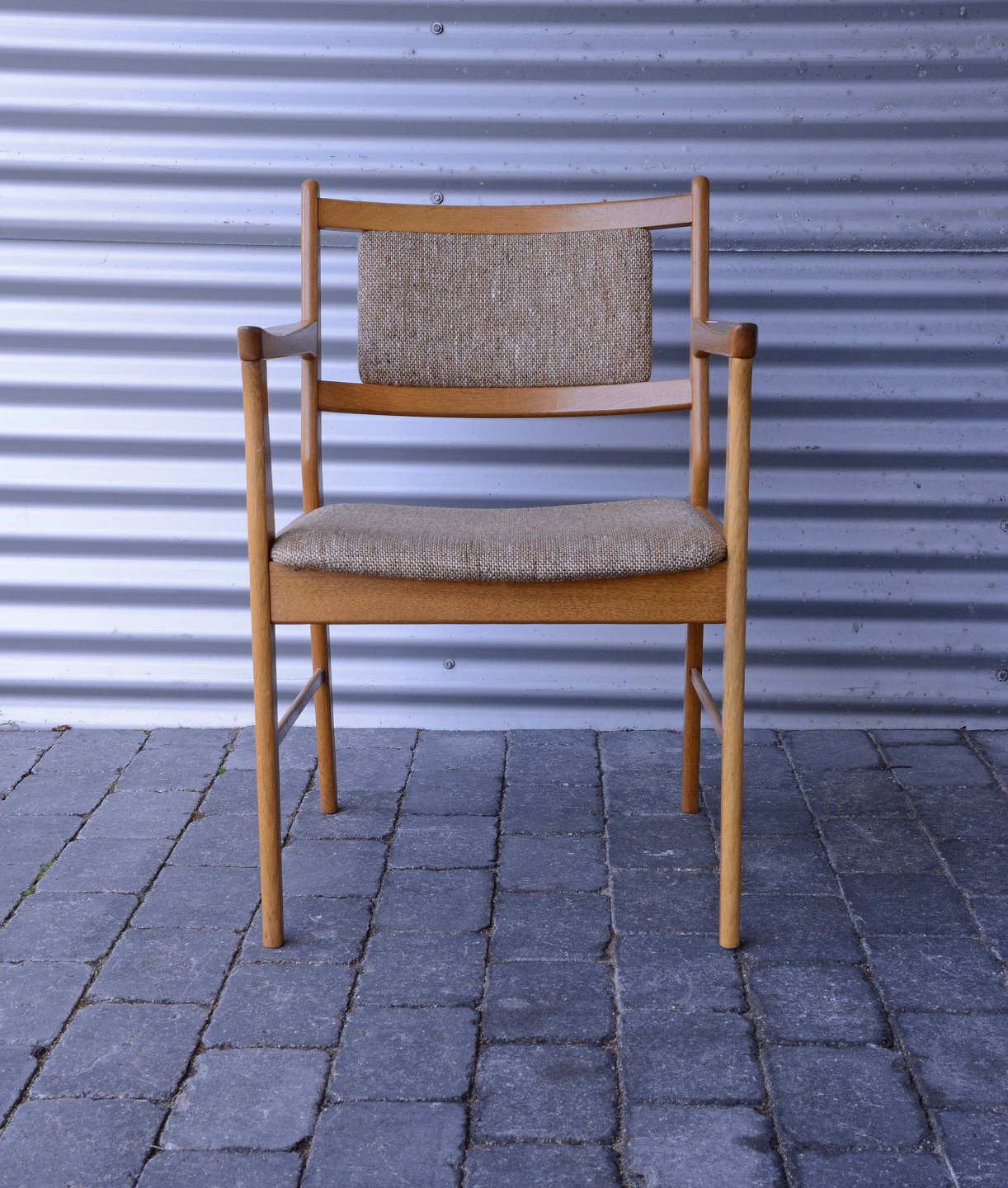 Armstol i egetræ med stofbetrukket sæde og ryglæn