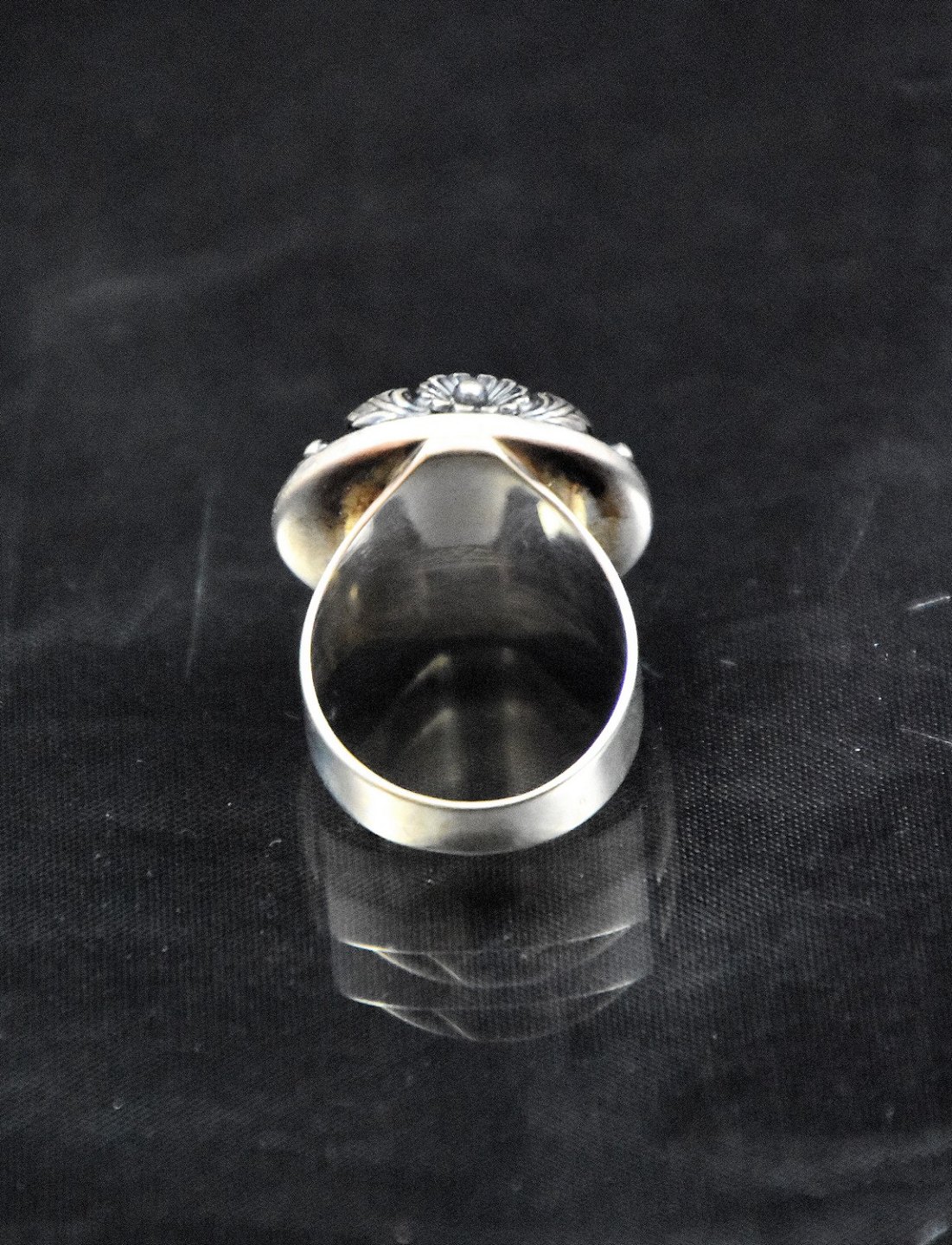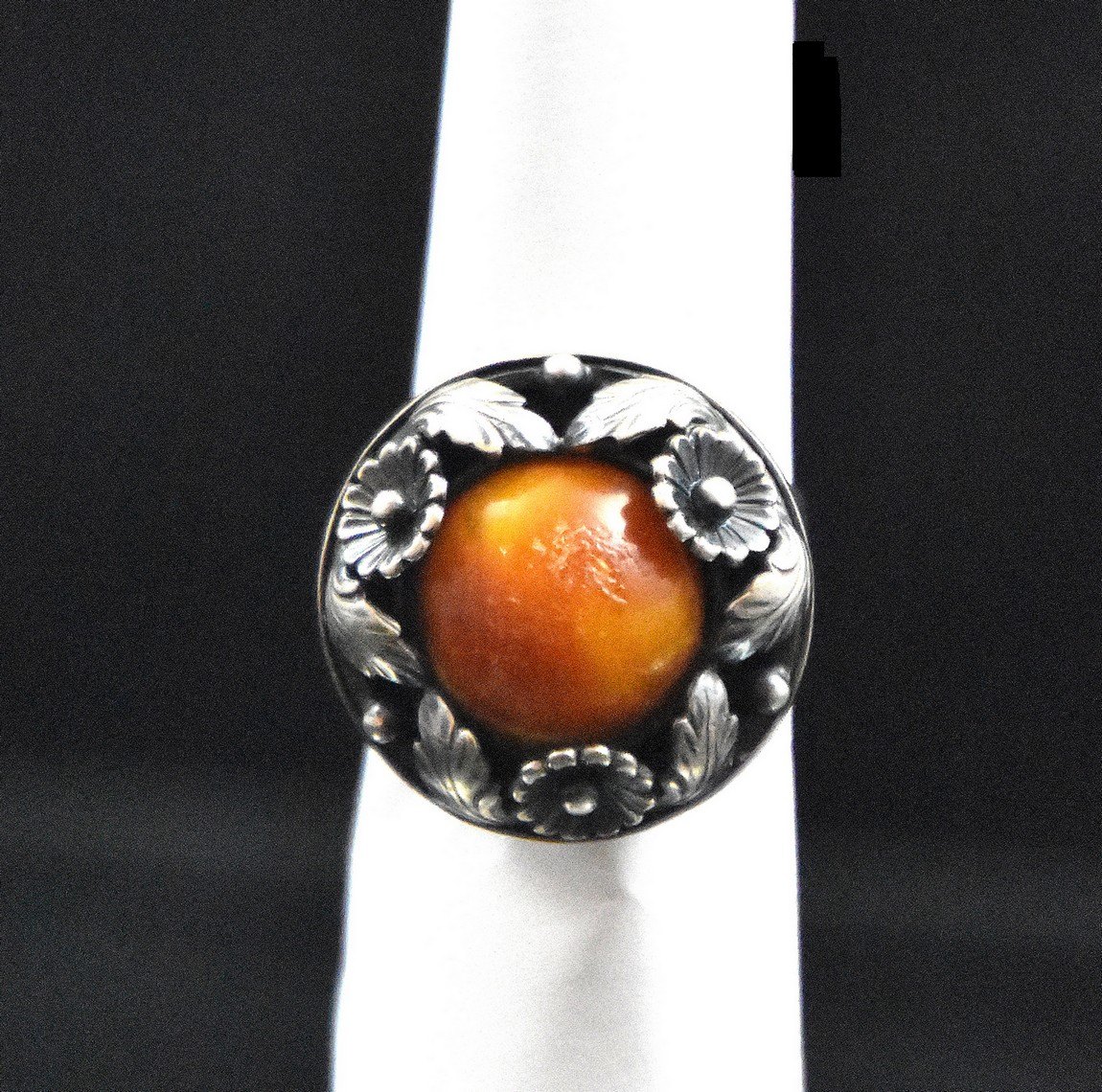 Sølvring (925s) med ravsten, dekoreret med en krans af blomster