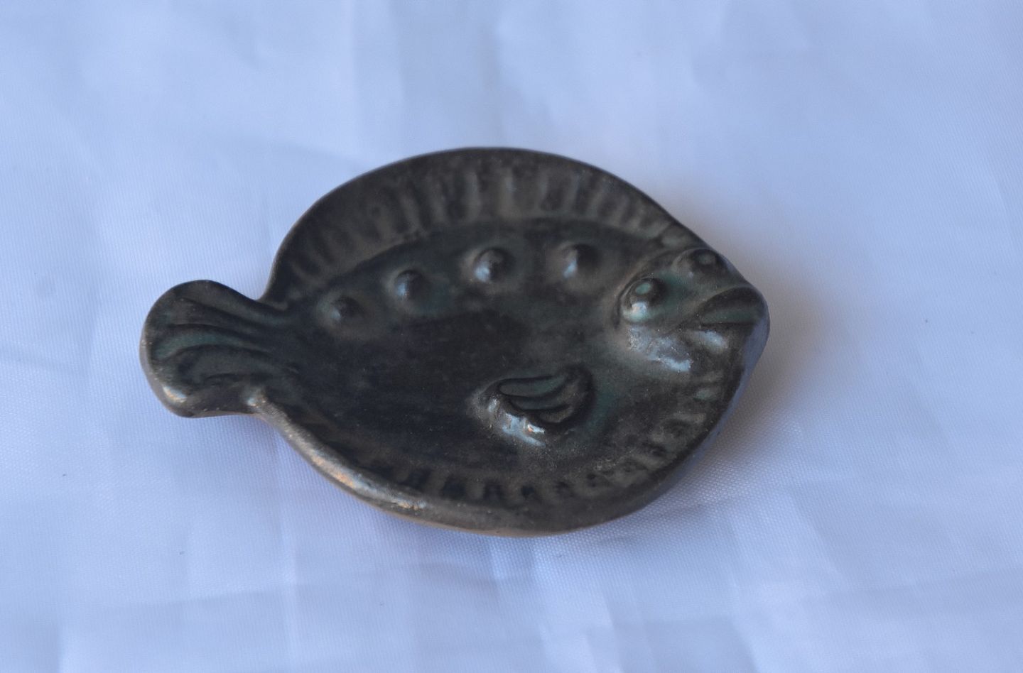Figur i grønglaseret keramik med motiv af lille fladfisk