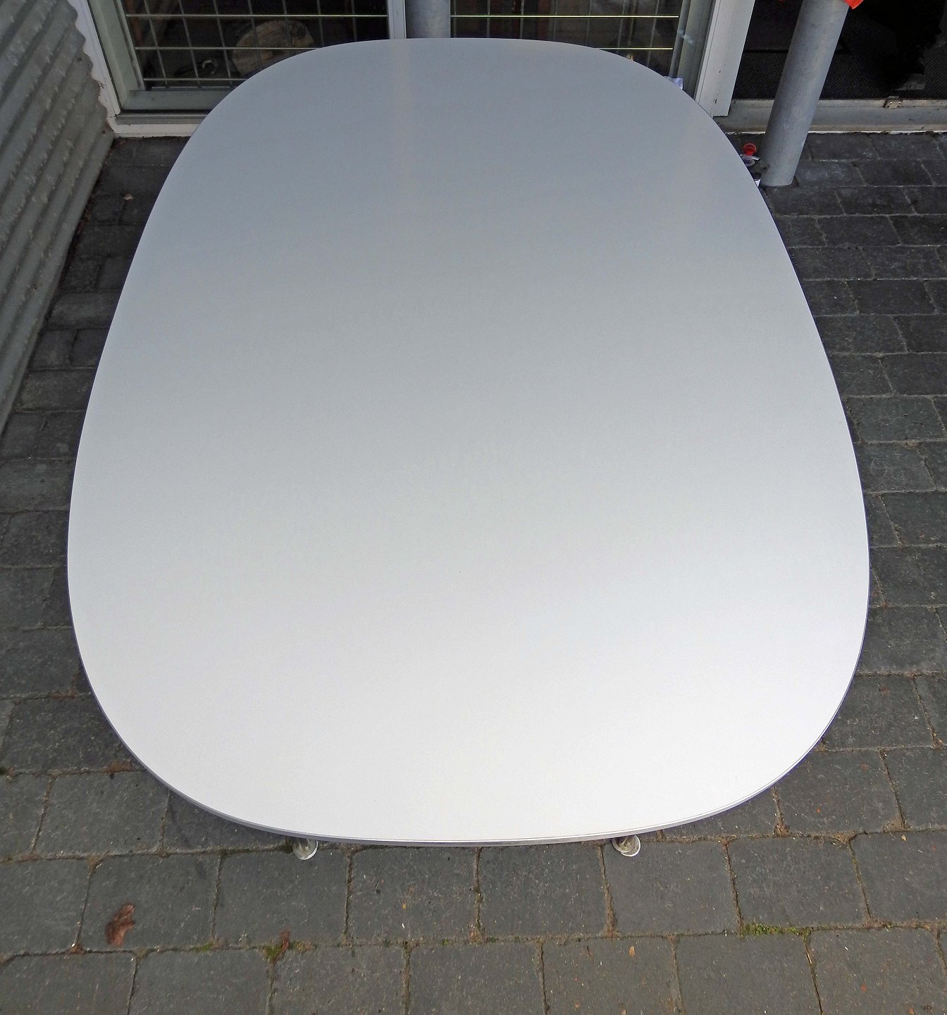 Ellipse bord med topplade i hvid laminat med aluminiumskant og forkromet stel.