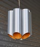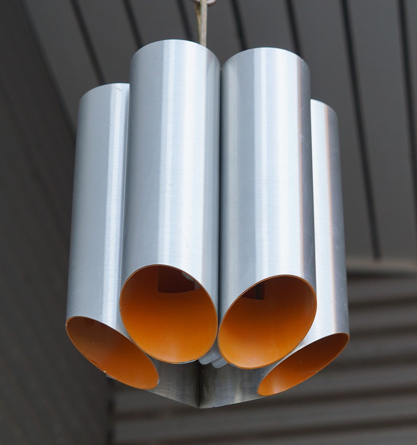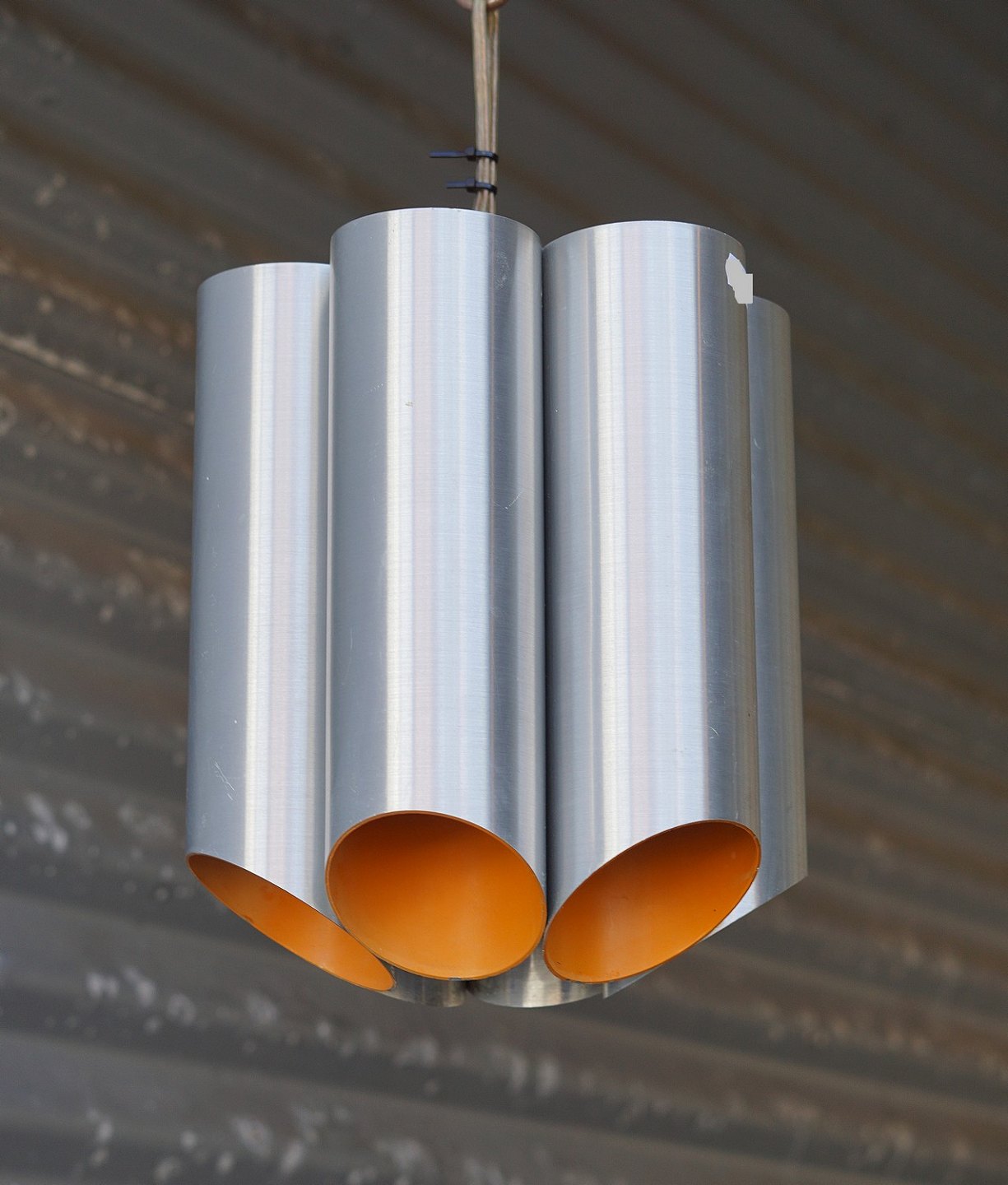 Hængelampe af blank aluminium og malet orange indeni.