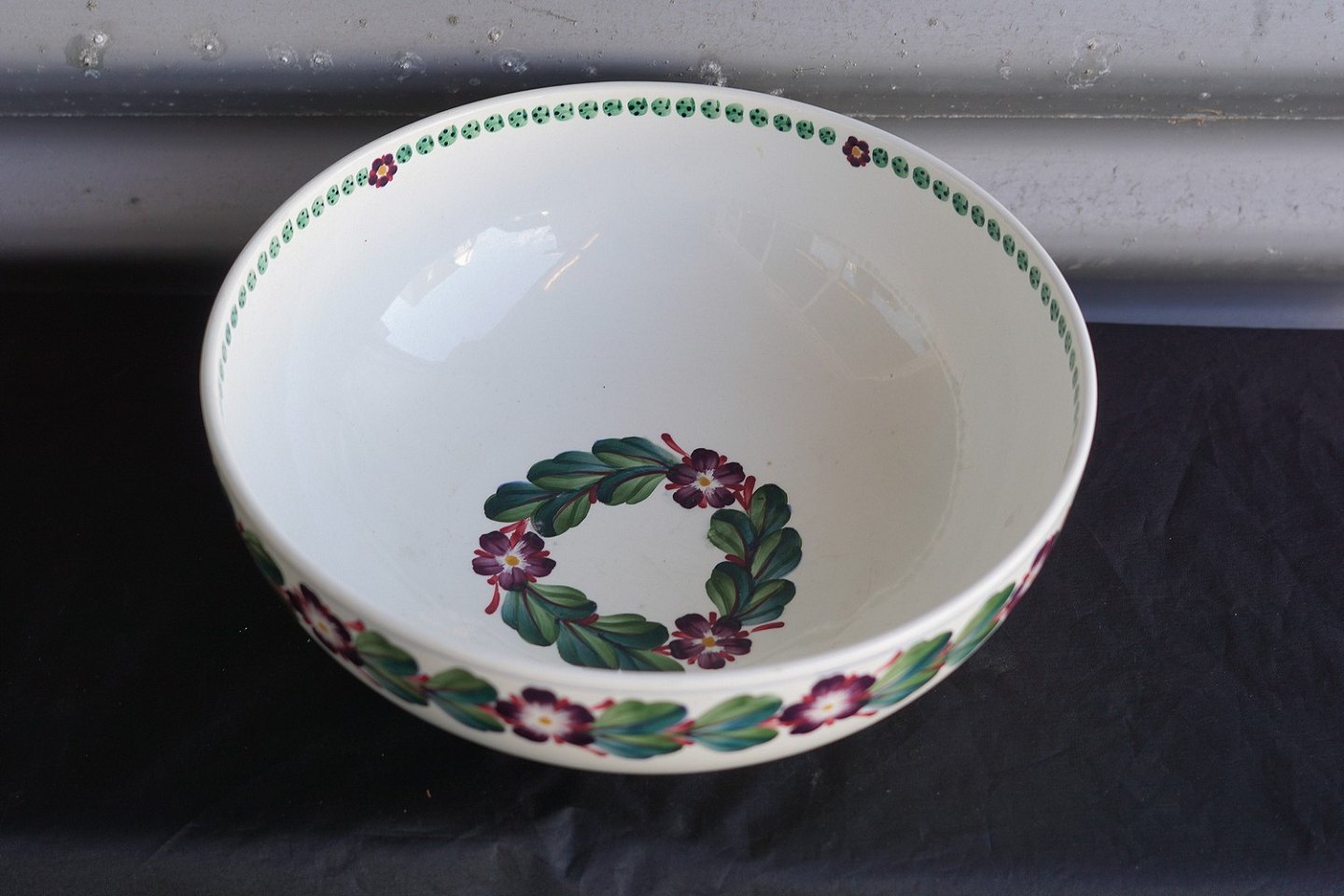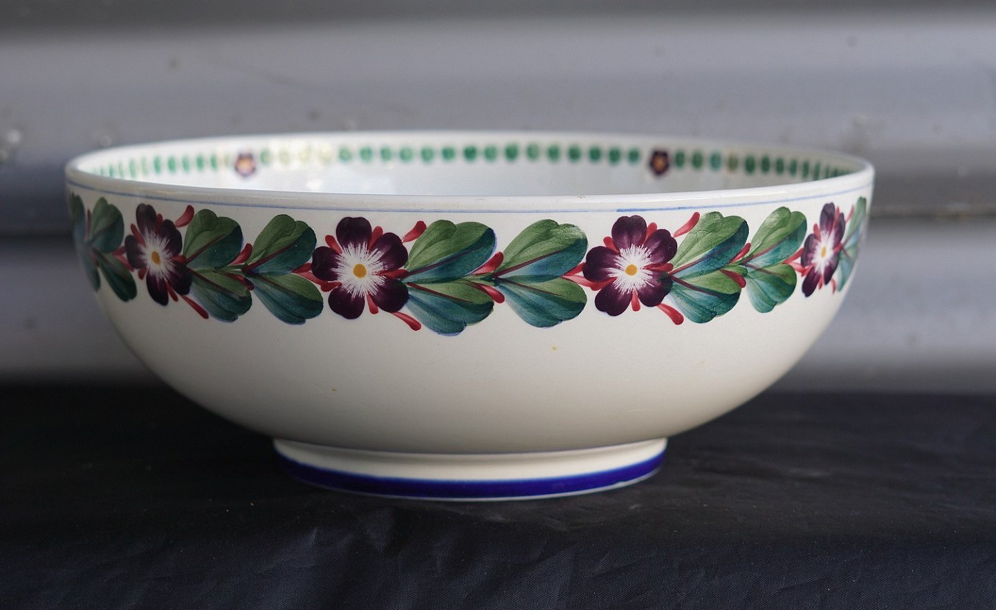 Aluminia skål af fajance, dekoreret med blålilla aurikler og grønt bladværk (464/268)