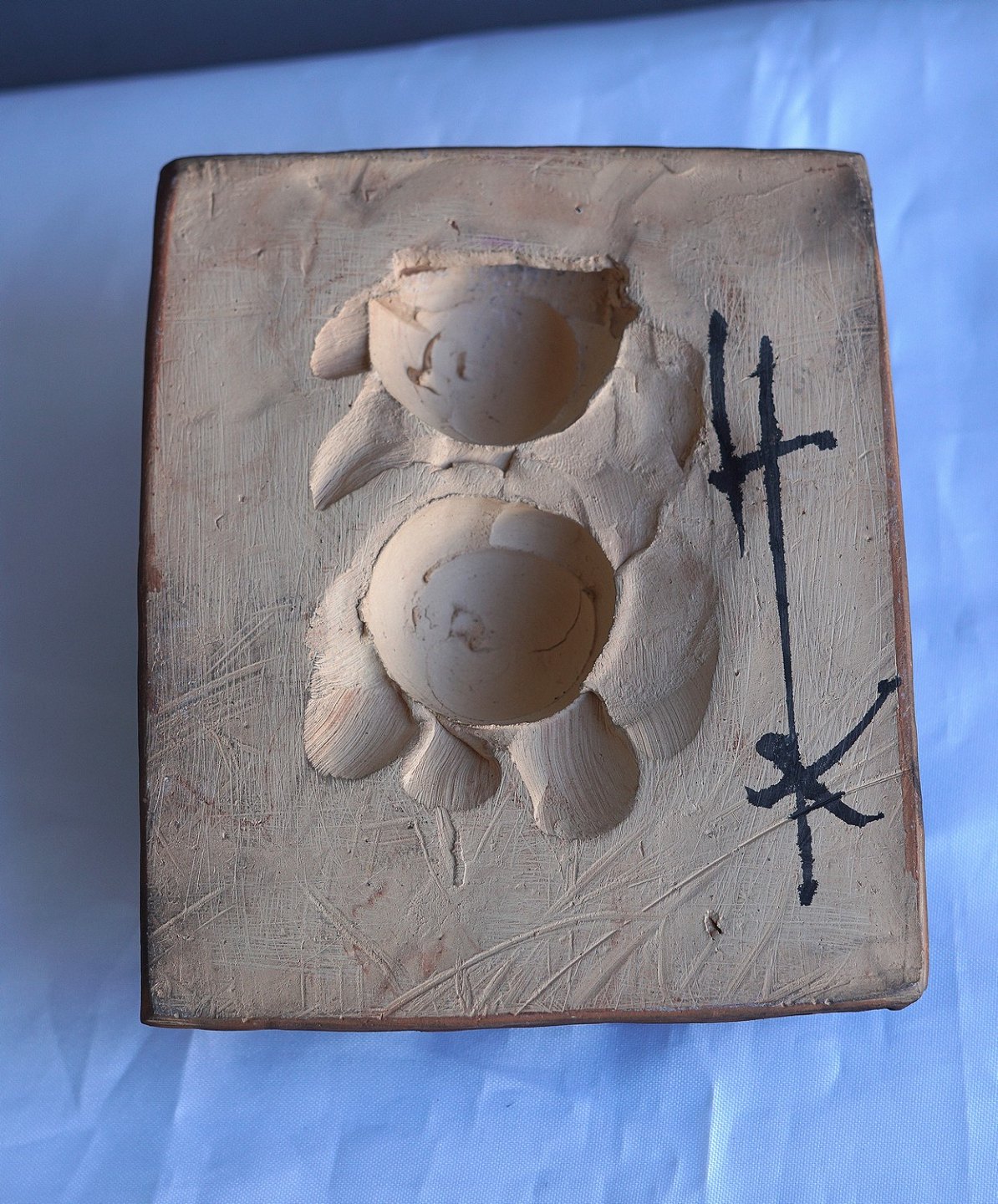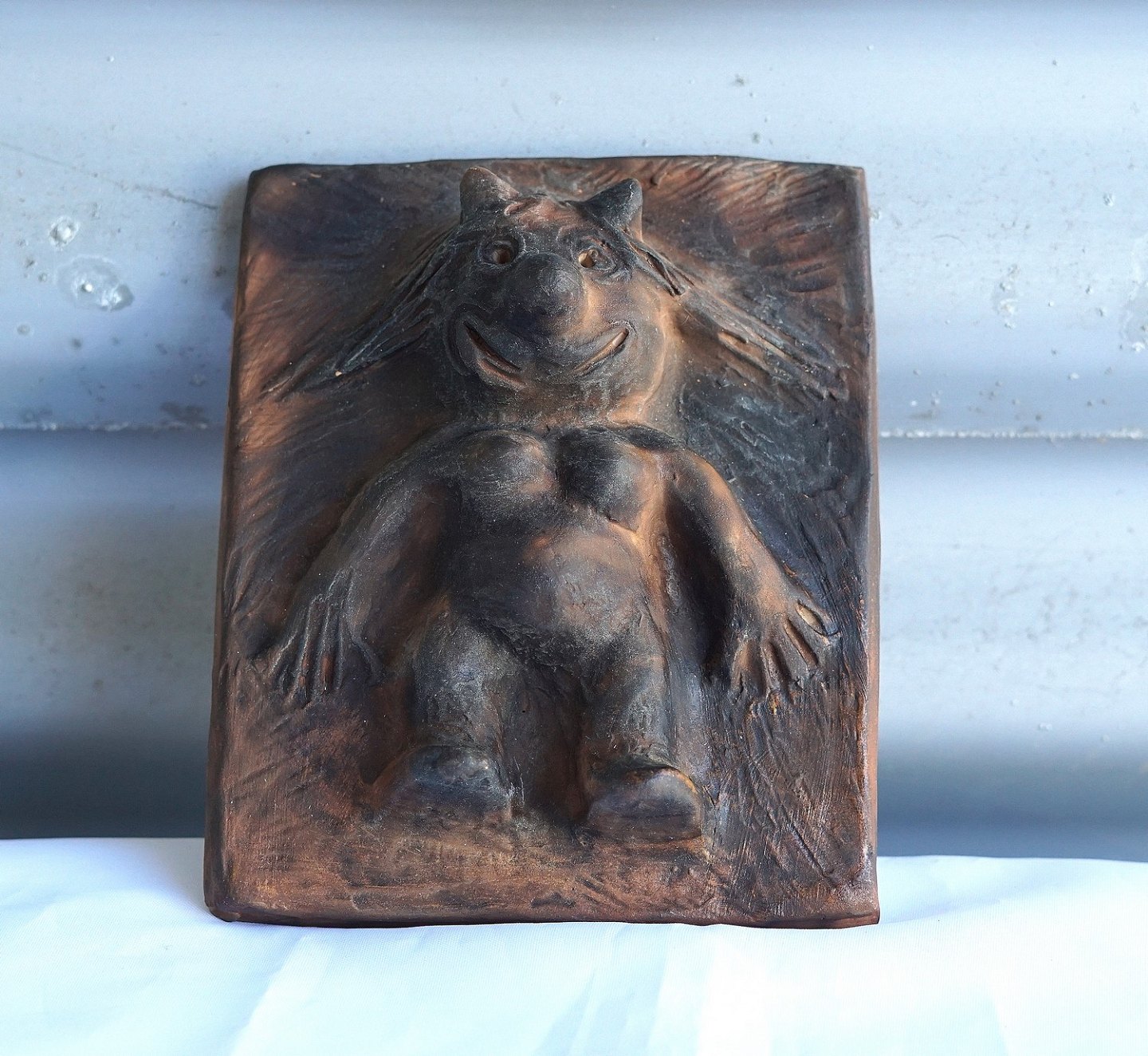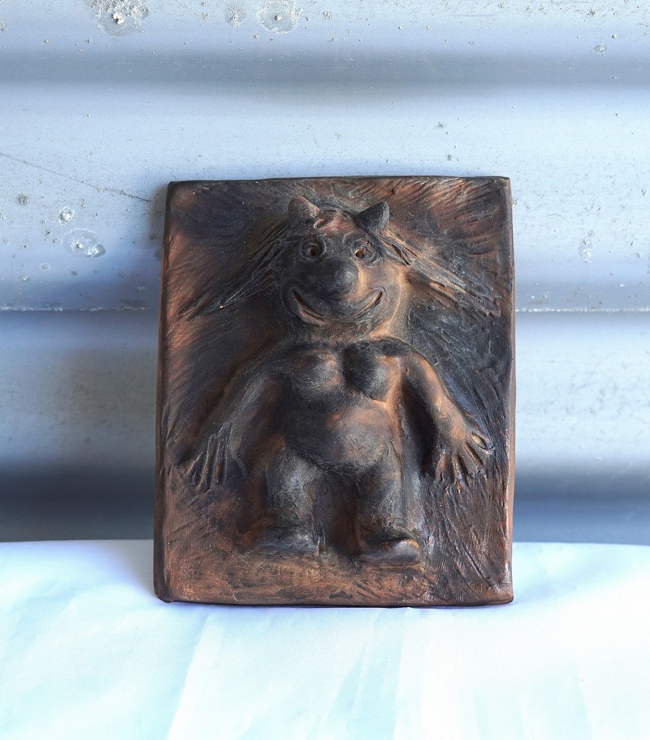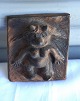 Kvindelig trold, nøgen, der bare står. Relief af keramik
