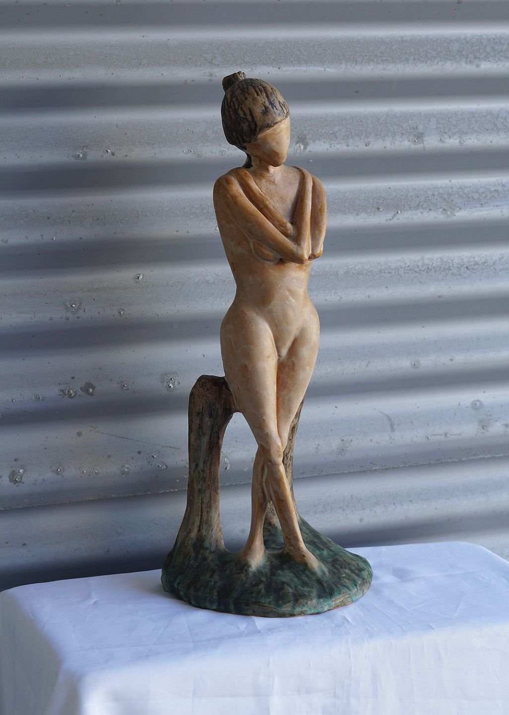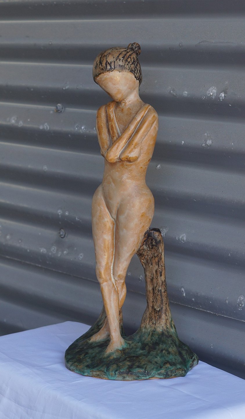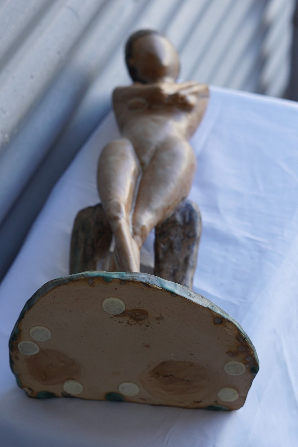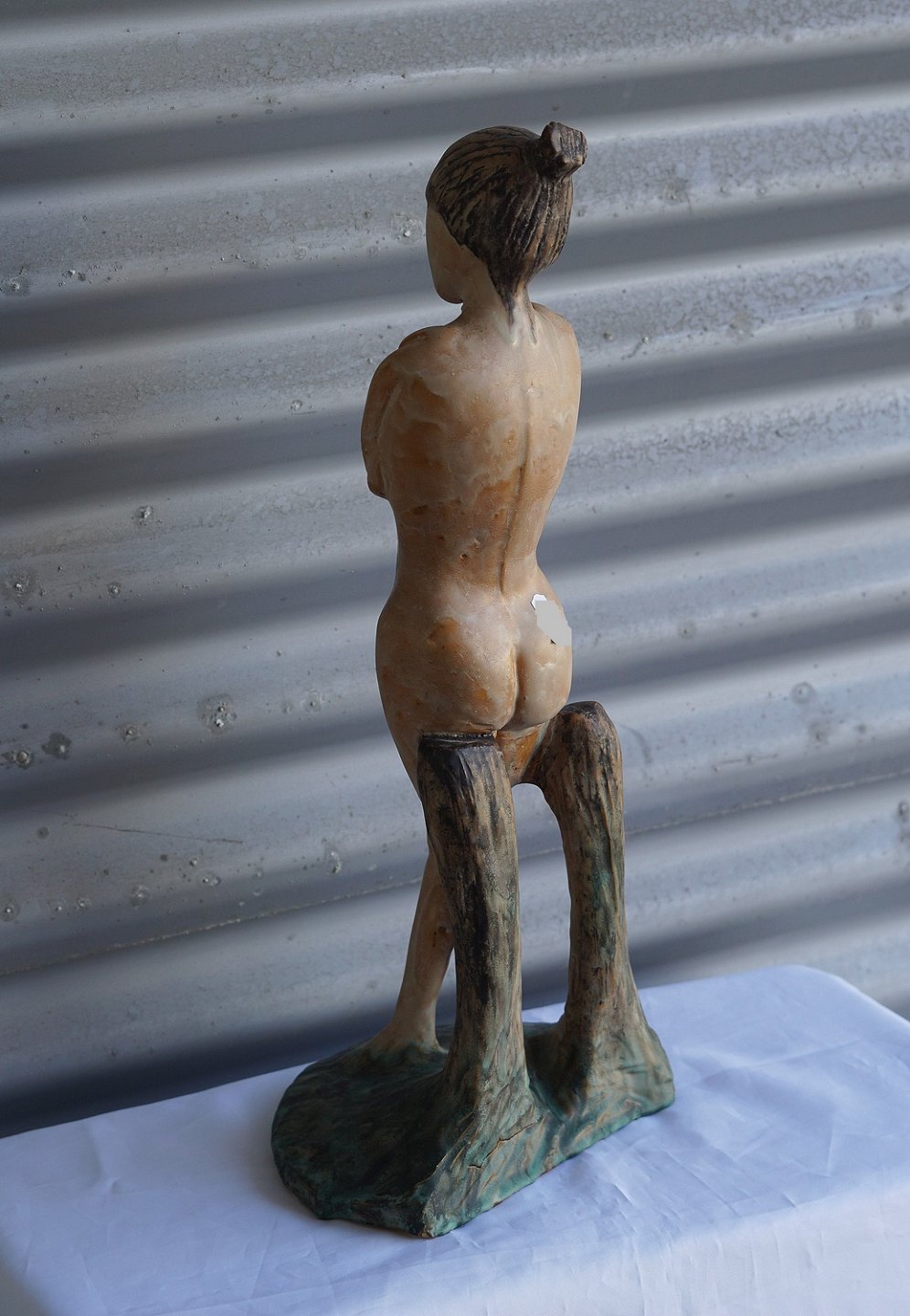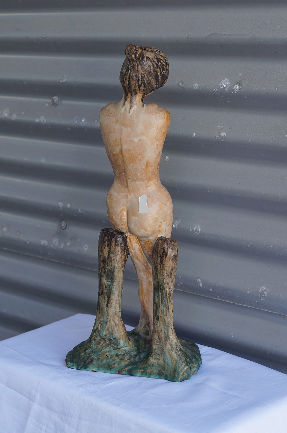 Figur af Nøgen kvinde Dame ved træstub i keramik