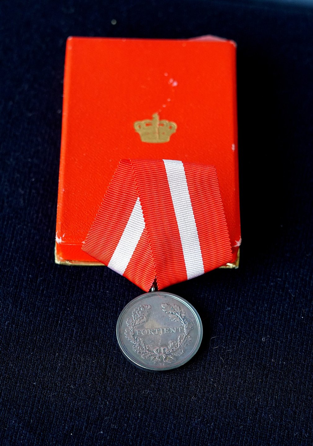 Frederik den 9. fortjeneste medalje, 11. marts 1953 og med knaphuls pynt, medaljen kommer i original æske.