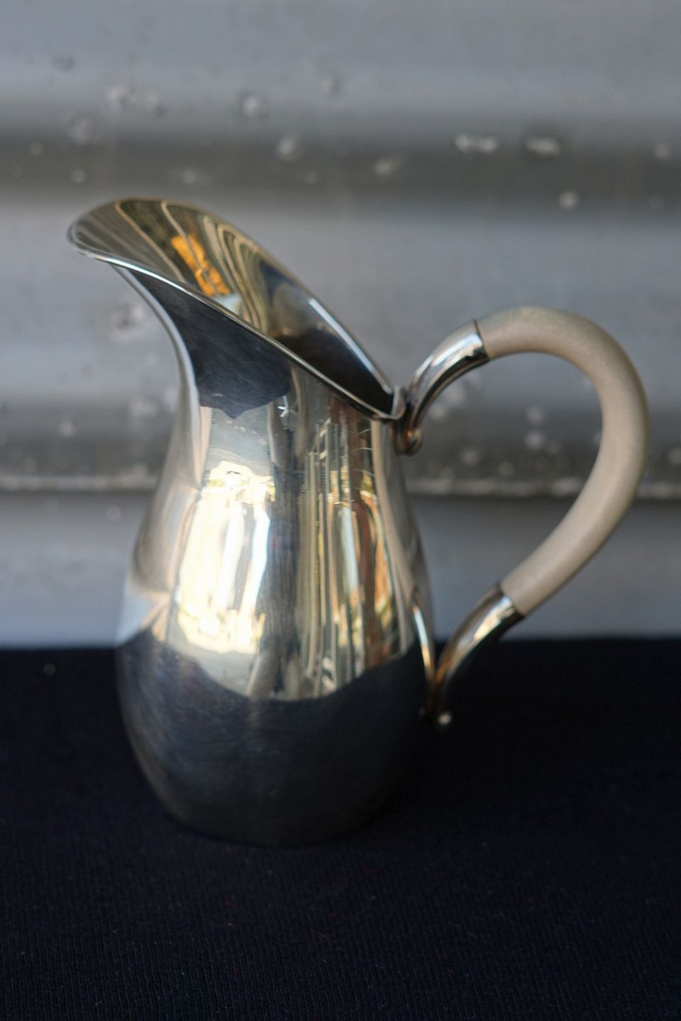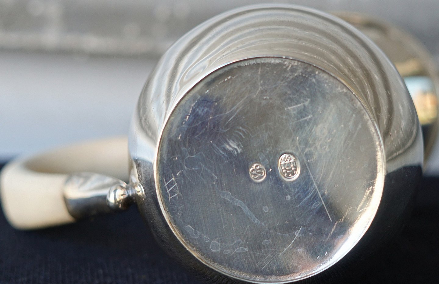 Flødekande med lys hank, lavet på Christian Jensen Sølvvarefabrik, flødekanden er fra 1959